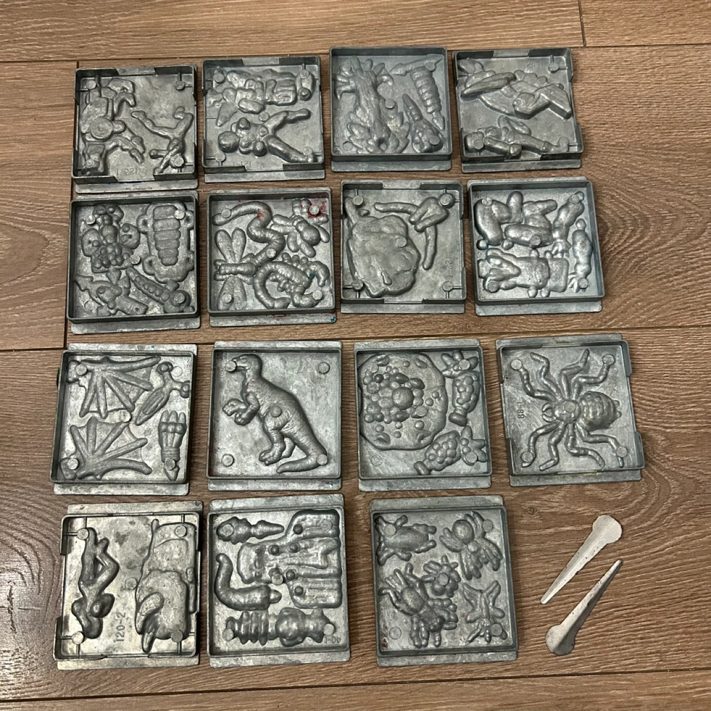 A rare and highly collectible collection of original die-cast metal molds produced by Toymax in the early 1990s. These heavy-duty plates were designed for use with the Metal Molder and Creepy Crawlers workshop sets and feature crisp, deeply engraved designs.