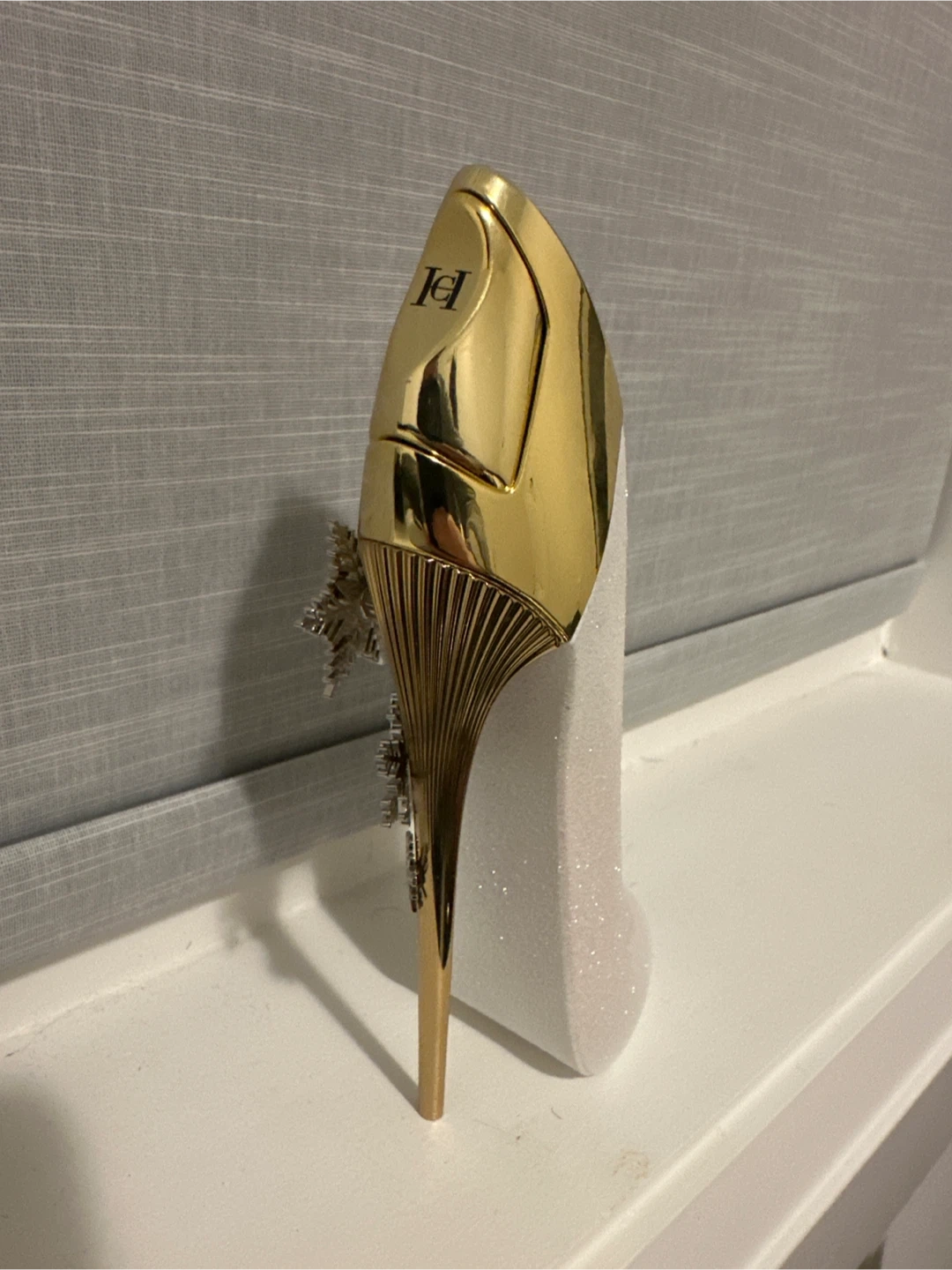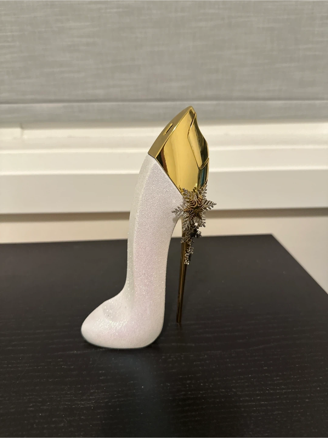 This is a tester bottle of Carolina Herrera Good Girl Eau de Parfum limited edition. It's 80 ml or 2.7 fluid ounces. The bottle is designed as a white glitter stiletto heel with gold accents and snowflake embellishments.