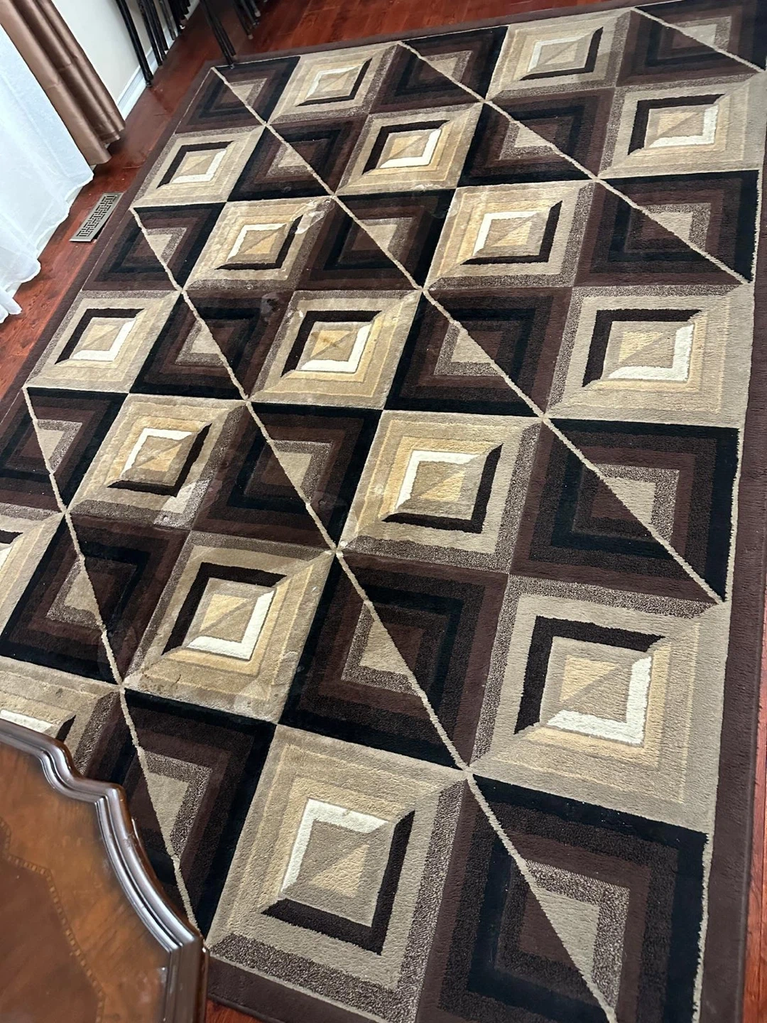 A spacious area rug featuring a geometric pattern in shades of brown, beige, and black. Its dimensions make it suitable for a living room or common area. Adds warmth and style to your home! 60$ or OBO