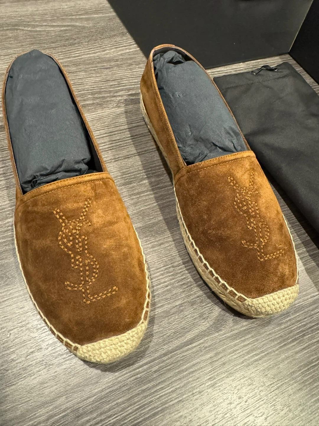 10Saint Laurent espadrilles in a lovely brown suede material. The shoes feature the YSL logo stitched on the front. They come with the original dust bag!