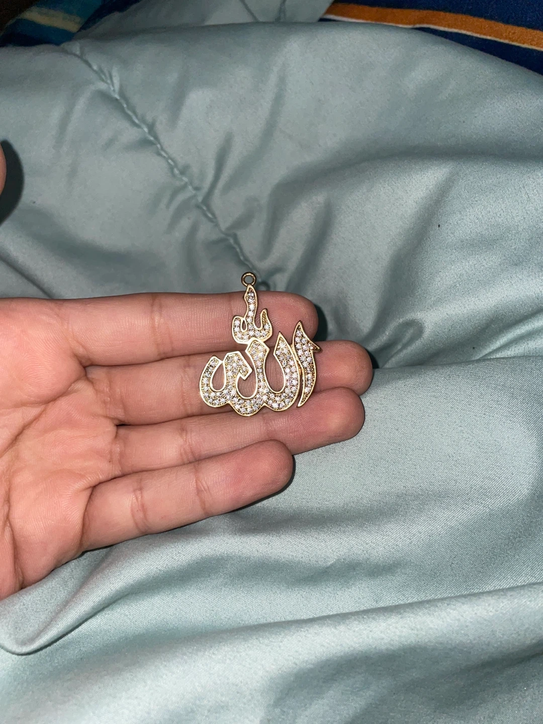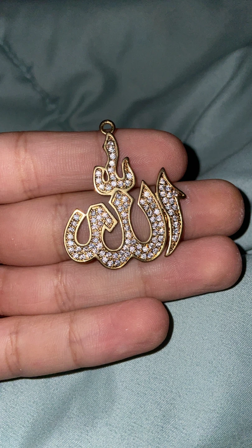 Selling a gold Allah pendant. It appears to be in good condition with some stones set into the design. Perfect for anyone looking for a unique piece of jewelry