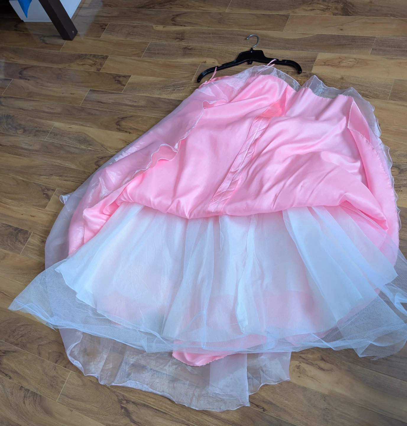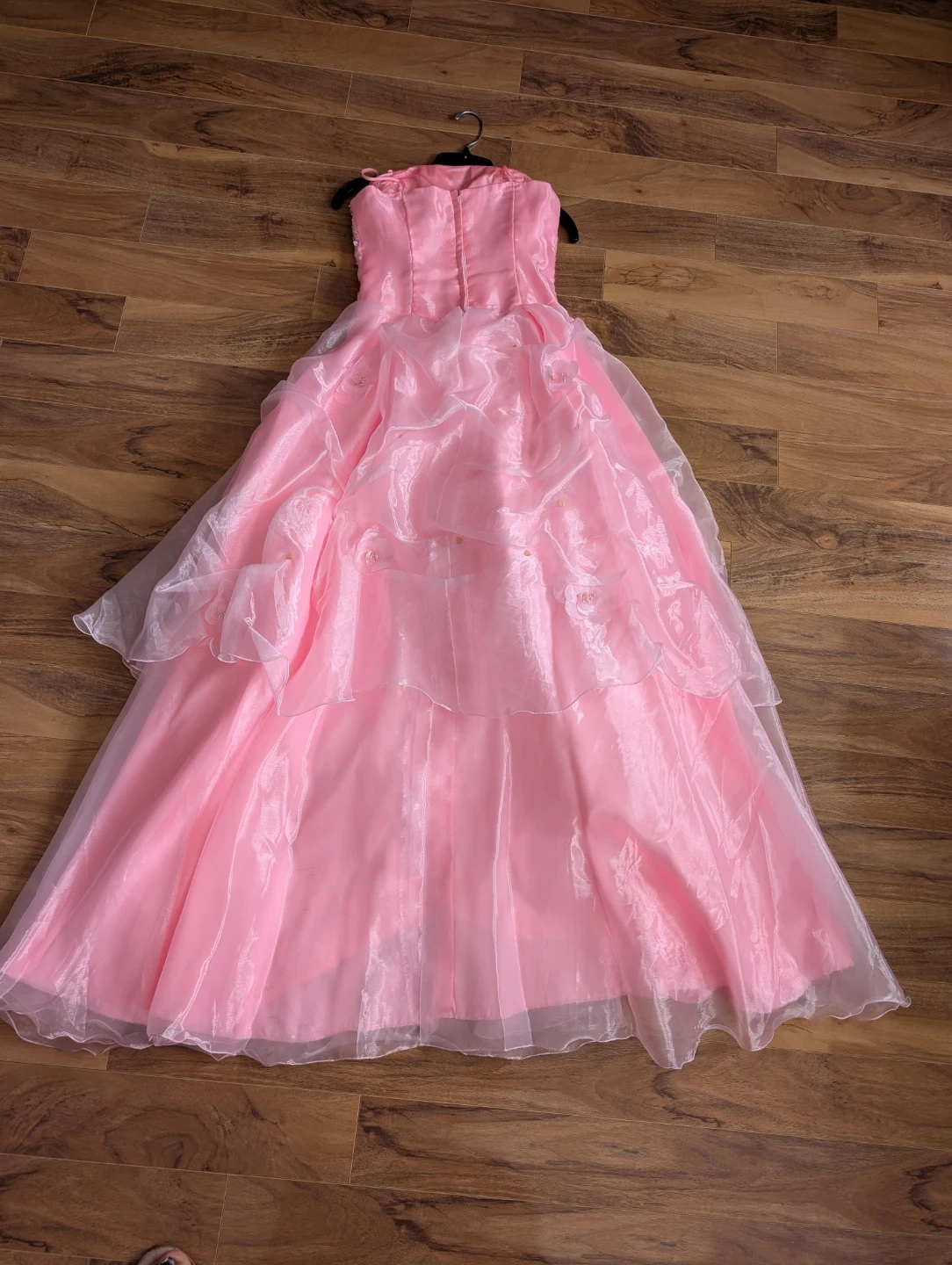 This beautiful pink formal gown features delicate beading on the bodice and floral accents throughout the layered skirt. It's crafted from shimmering organza and satin for a dazzling effect. Perfect for special occasions! sweet fifteen, (quinceañera)