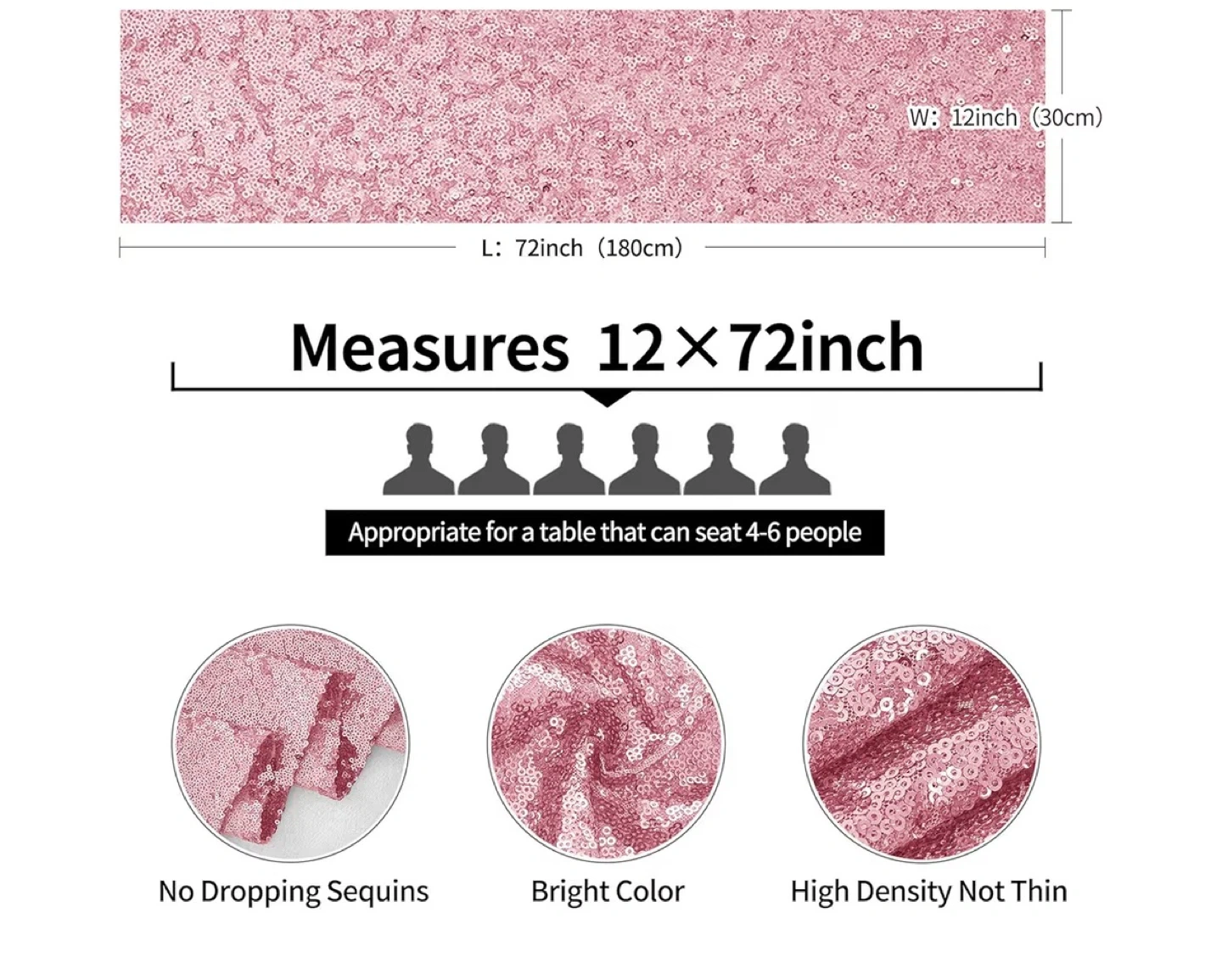 These table runners come in a pack of two, each measuring 12 inches wide by 72 inches long. They're made with bright pink sequins and are designed to not drop sequins. Appropriate for tables seating 4-6 people.