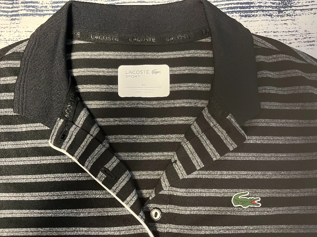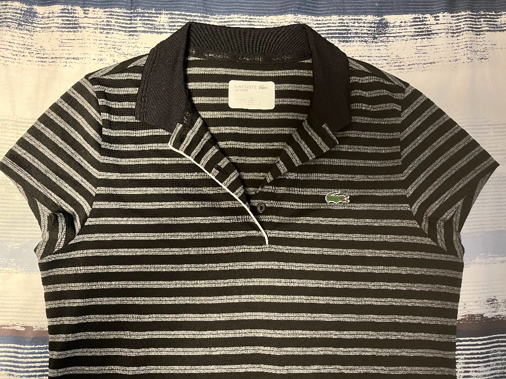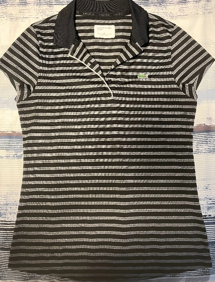 Women's short sleeve polo shirt. Black and grey striped pattern. Size 26. Classic Lacoste design.