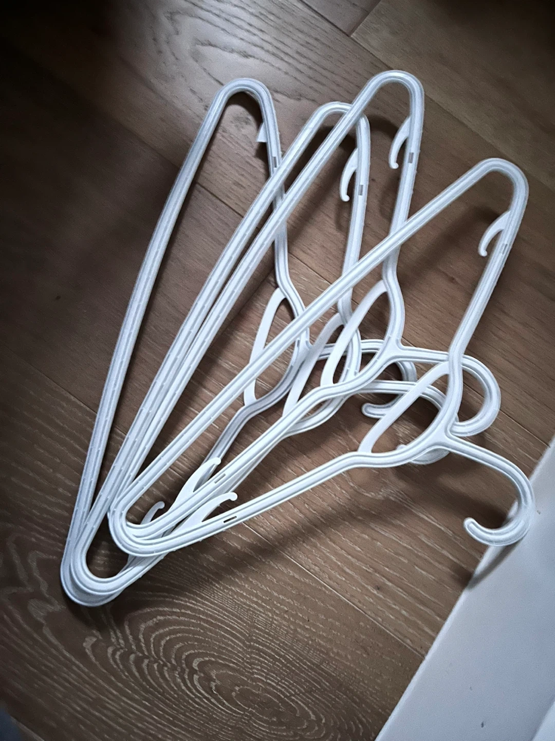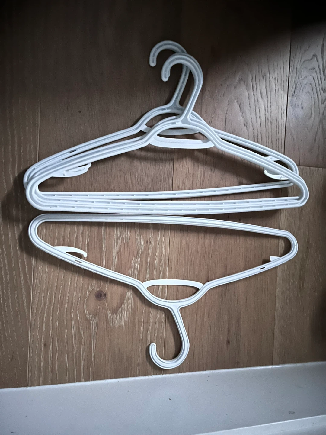 Selling a set of white plastic clothes hangers. They're in great shape and ready to organize your closet