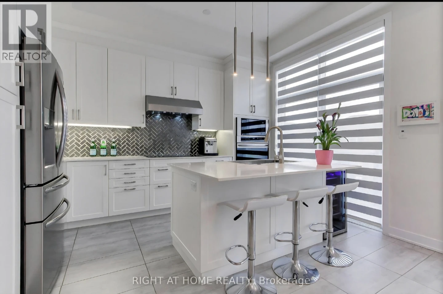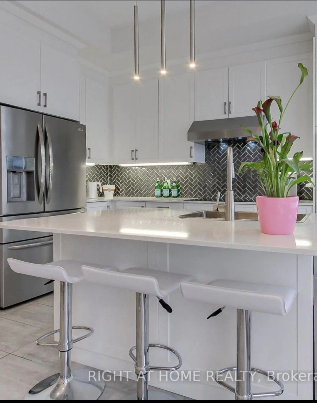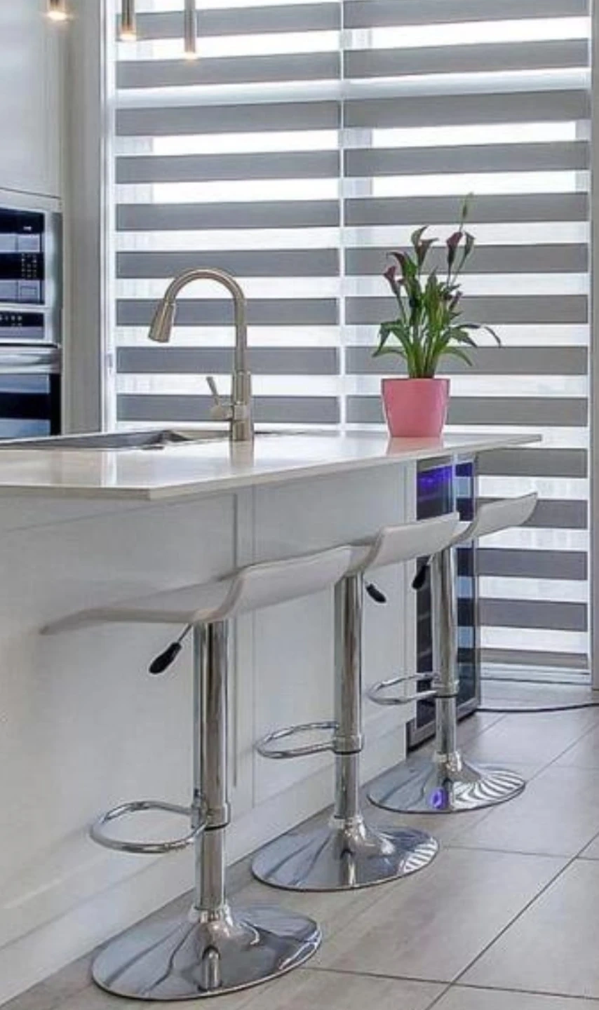 Three white bar stools, perfect for a kitchen island or home bar. They feature adjustable height and a comfortable seat with a chrome base. Easy to wipe clean!