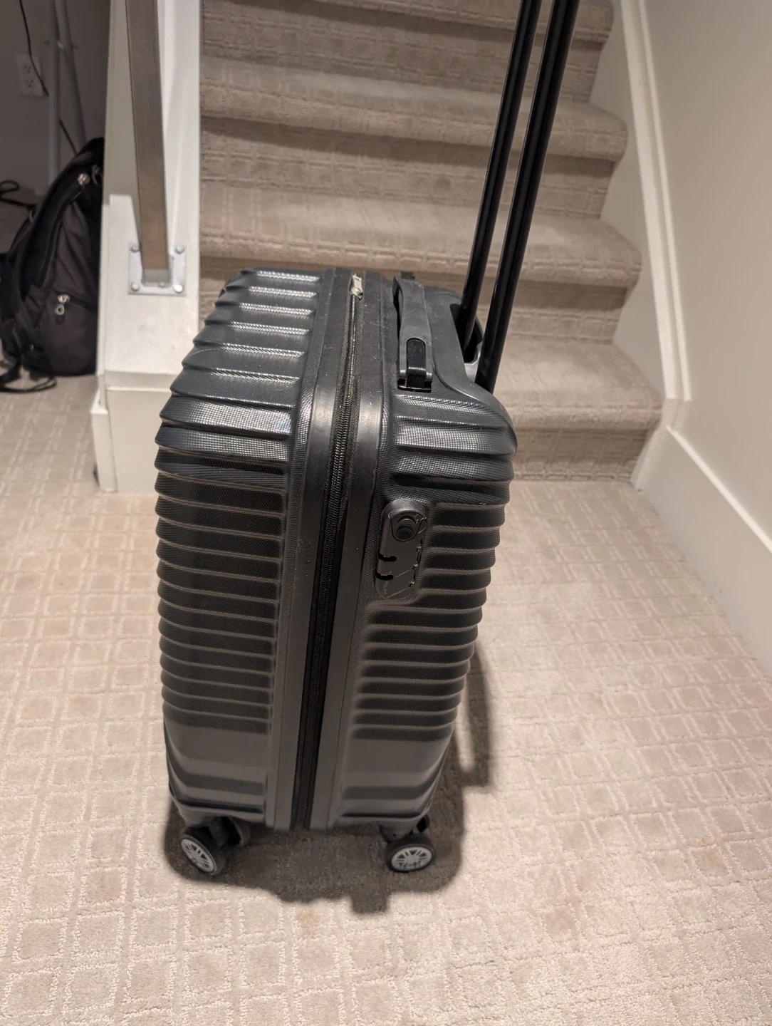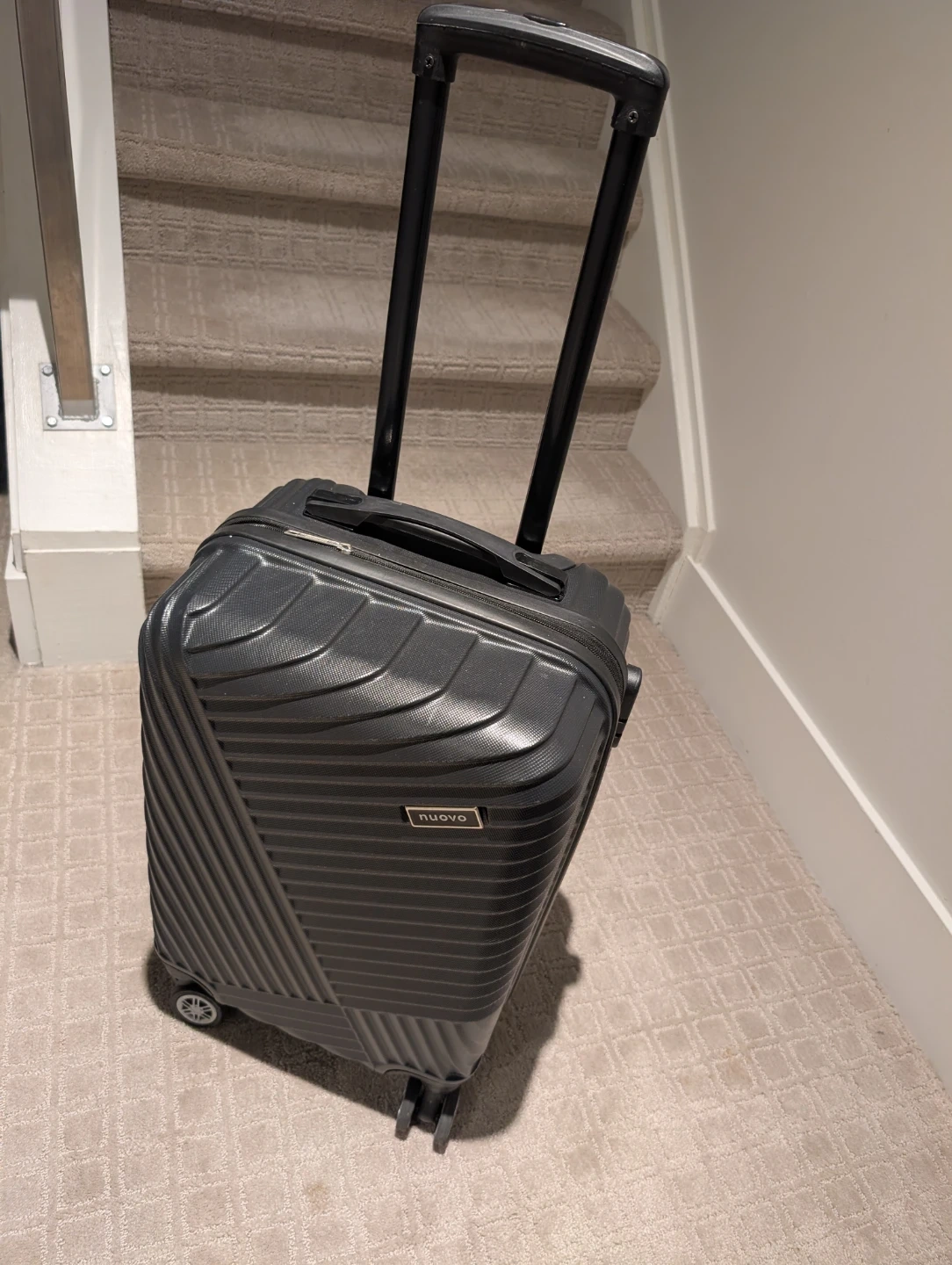 This Nuovo carry-on luggage is a dark grey hardside model. It's designed for easy travel with spinner wheels and a retractable handle. Perfect for weekend getaways or as a personal item on flights!