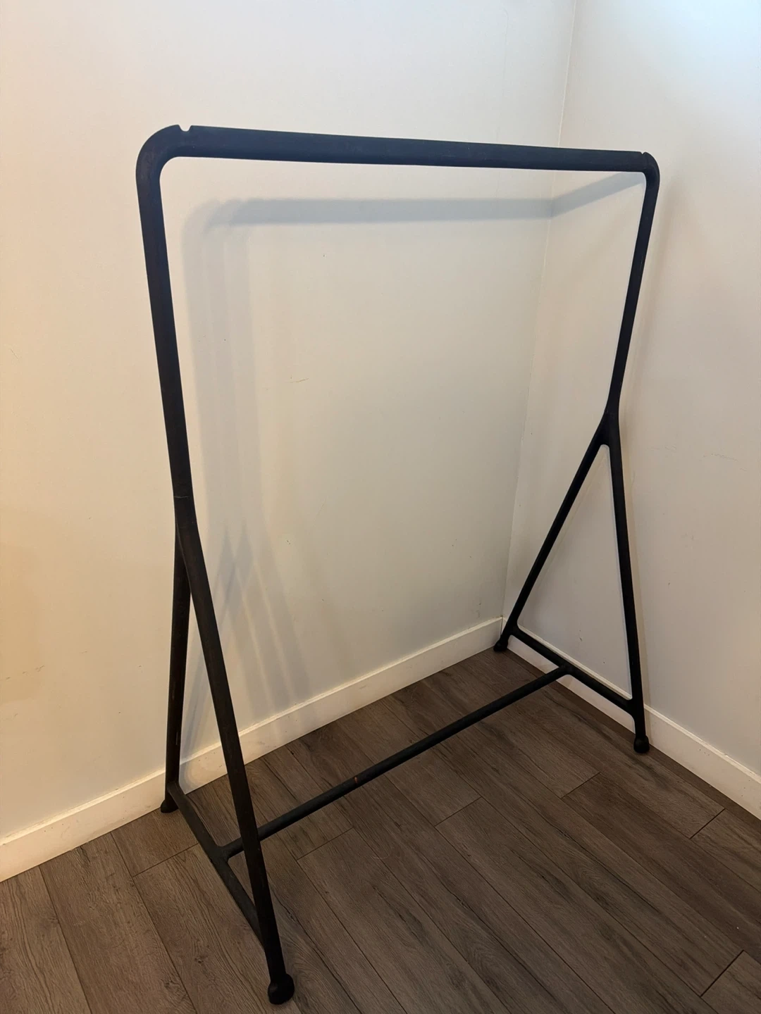 A simple black metal garment rack for hanging clothes. It's sturdy and has a modern, minimalist design. This rack is great for organizing your wardrobe or displaying items!