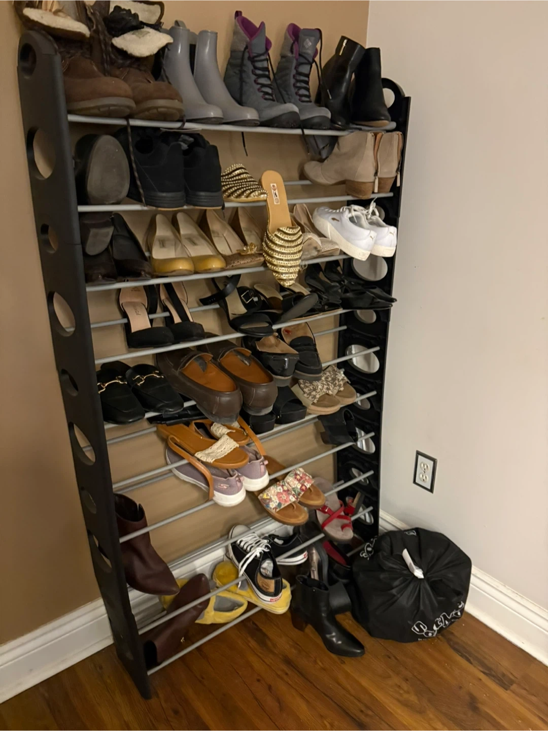 This sturdy metal shoe rack has five tiers, perfect for organizing your footwear. It's a great way to keep your shoes tidy and accessible. Plenty of space for all your favourite pairs!