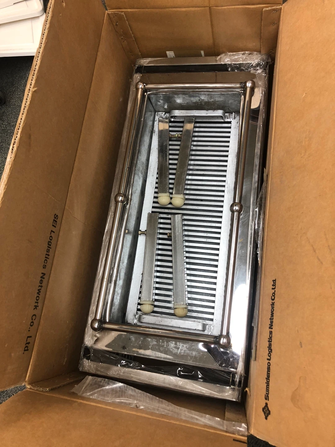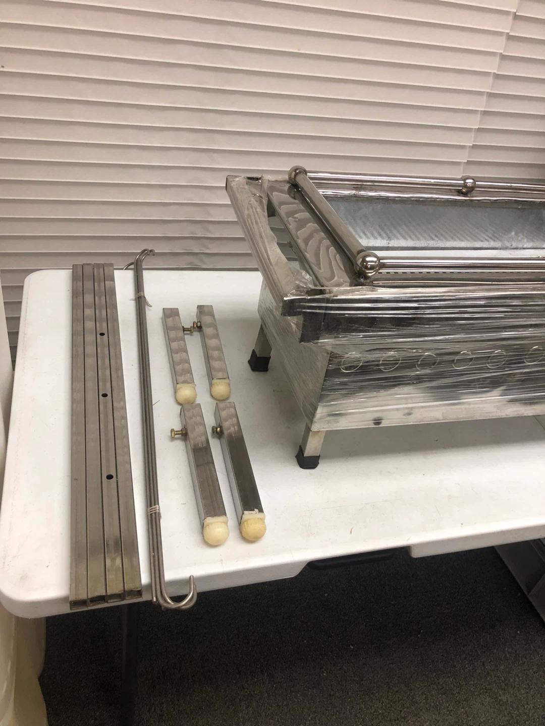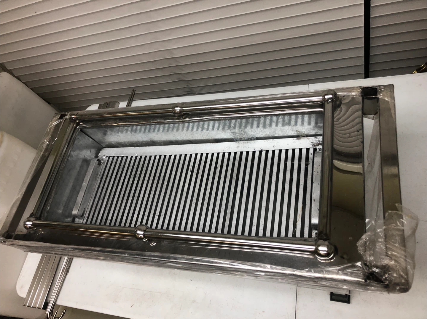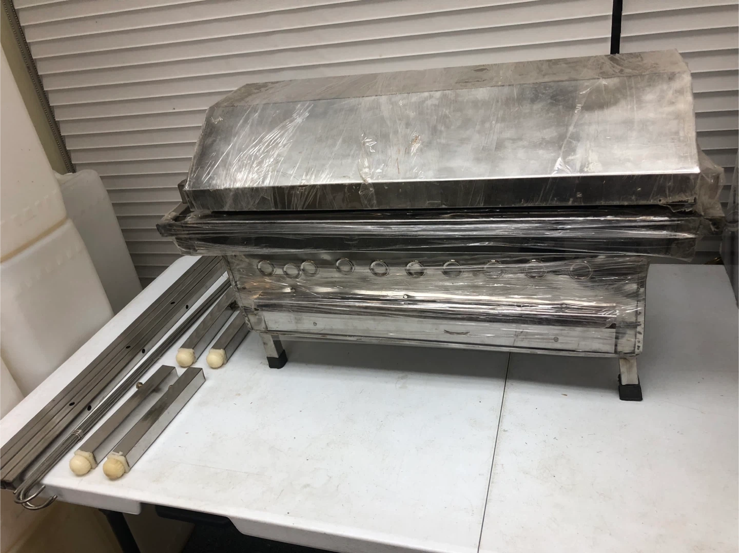 This stainless steel rotisserie grill is perfect for outdoor cooking. It comes with legs and other accessories for setup. Some parts are still in original packaging.