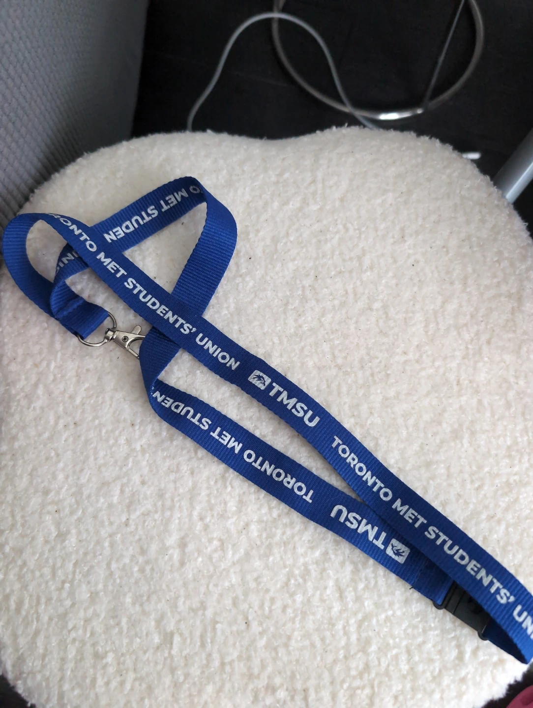 Blue lanyard with "Toronto Met Students' Union" and "TMSU" printed on it. It's made of durable fabric and includes a metal clip and a safety release clasp. This lanyard is perfect for students needing to carry their ID or access cards.