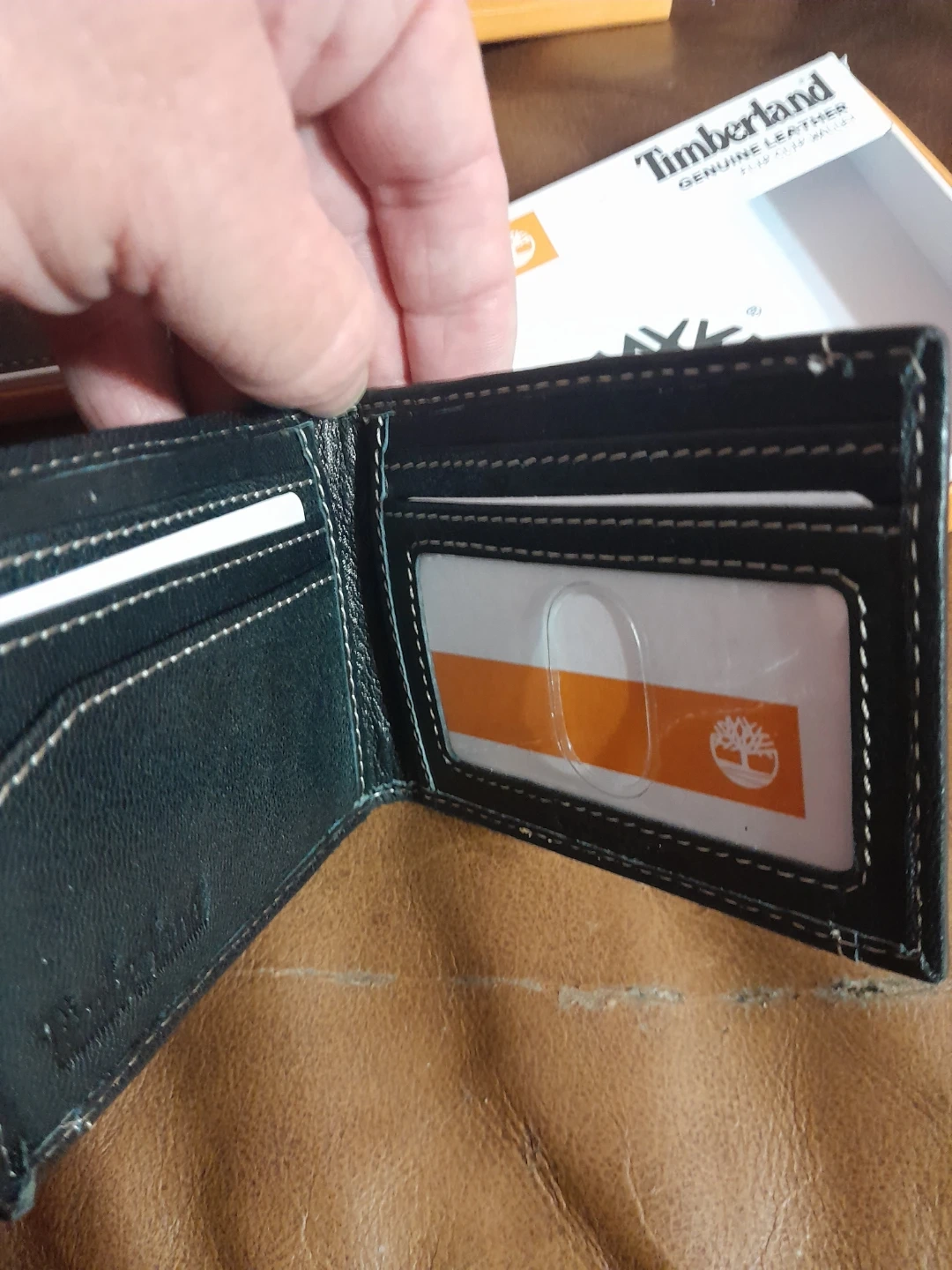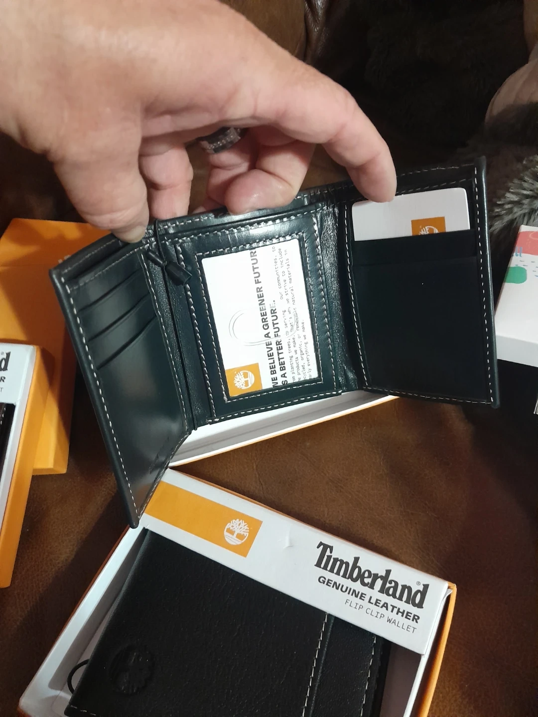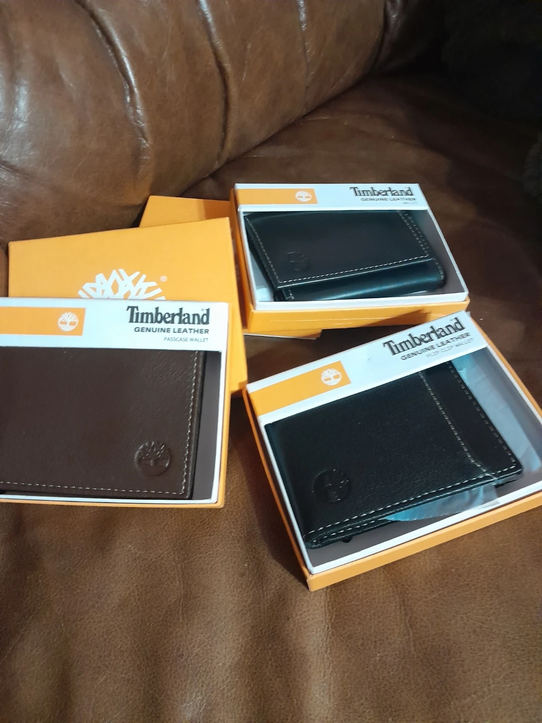 Selling three Timberland genuine leather wallets, two black and one brown. Each wallet is new in its original box and features classic stitching. They're made of durable leather. Flip clip card wallet, bi fold, tri fold brand new with tags and box your choice $10.00 each