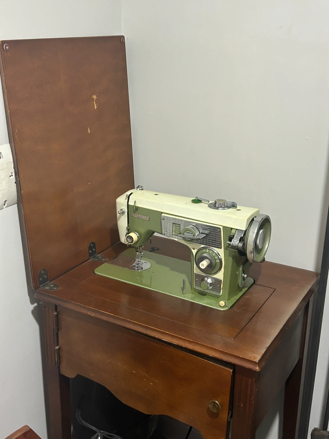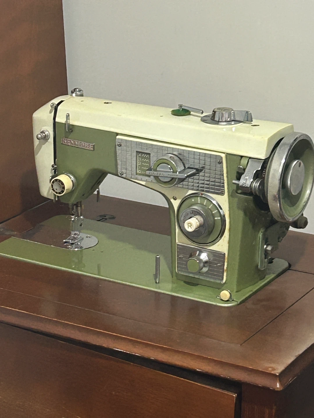 Classic Kenmore sewing machine in a cream and green colour scheme. It's a sturdy, reliable machine for all your sewing projects. This model offers various stitch options for versatility.