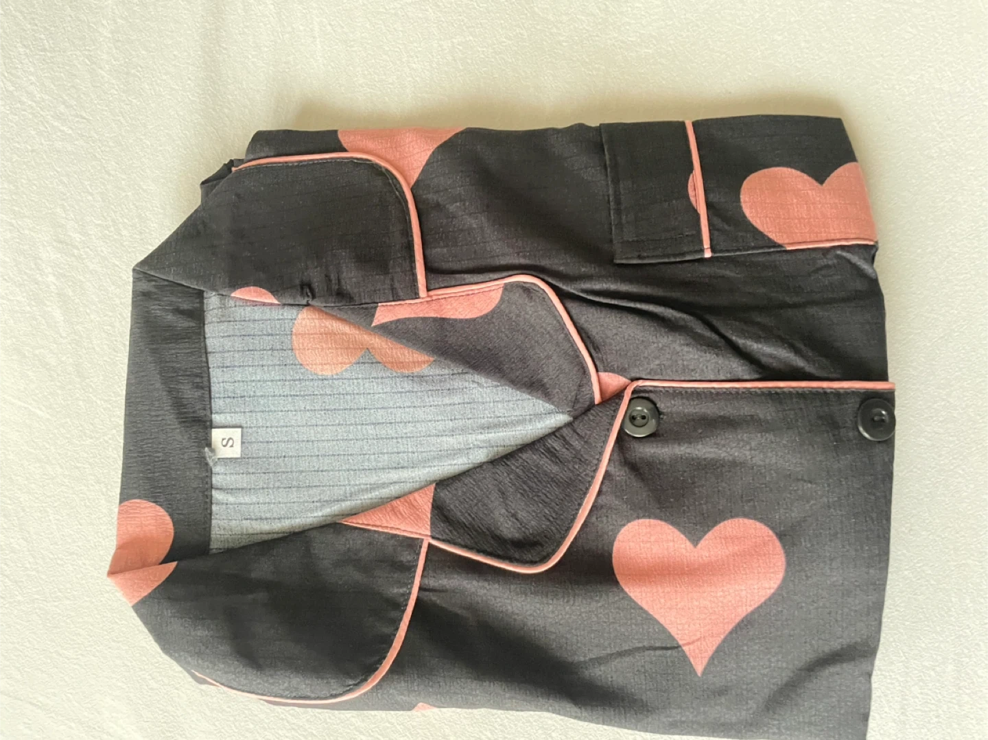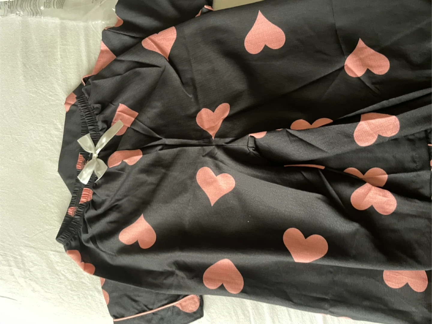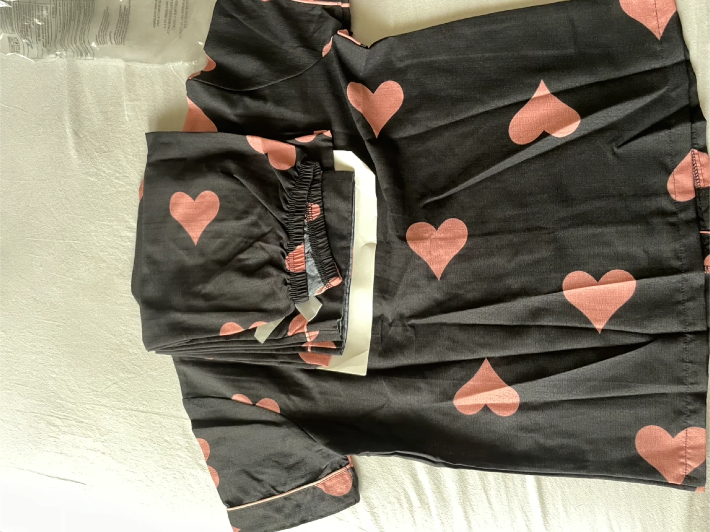 Comfy black pajama set with a cute pink heart pattern. Includes a button-up top and elastic waist pants. Size is small.