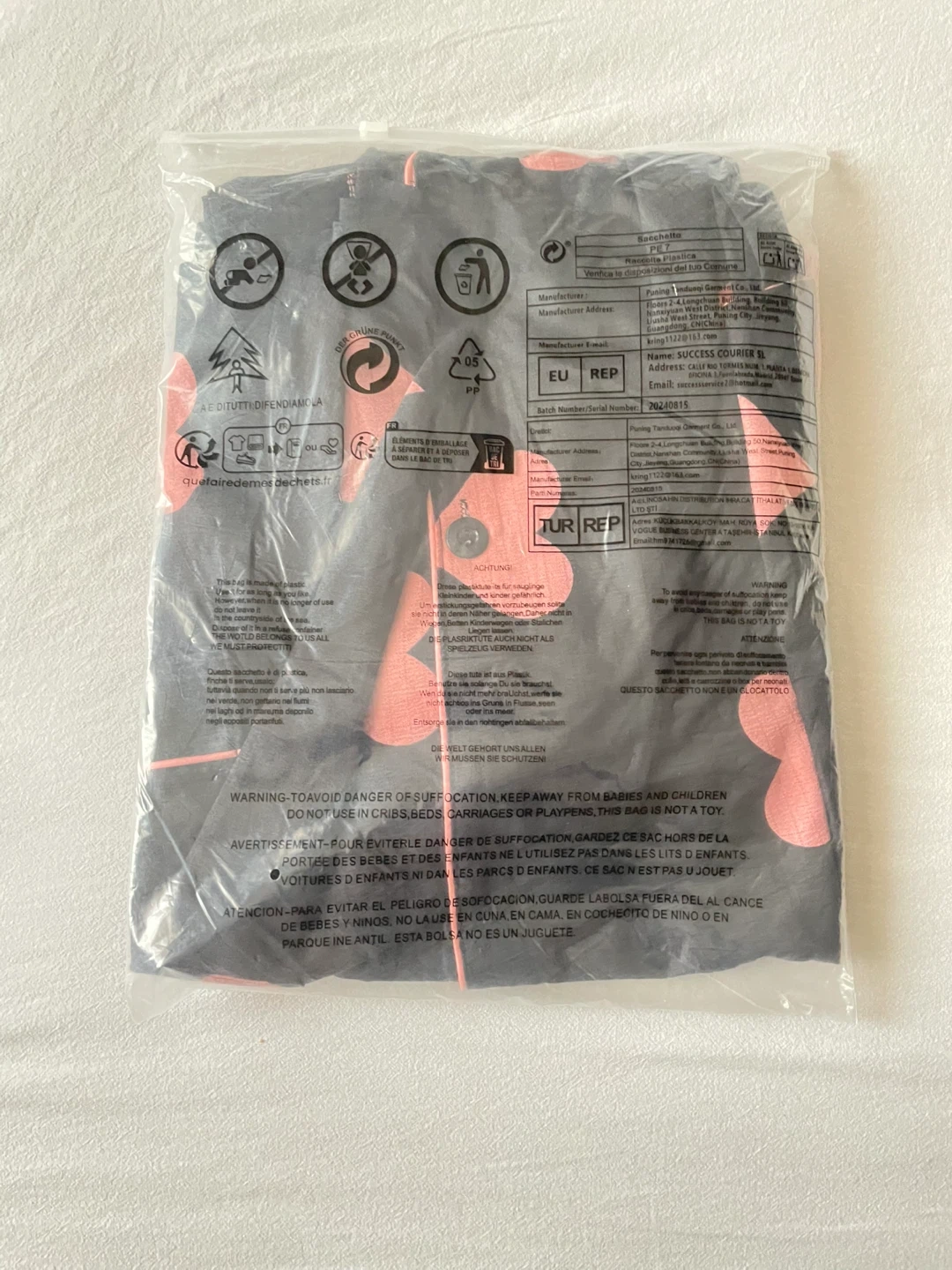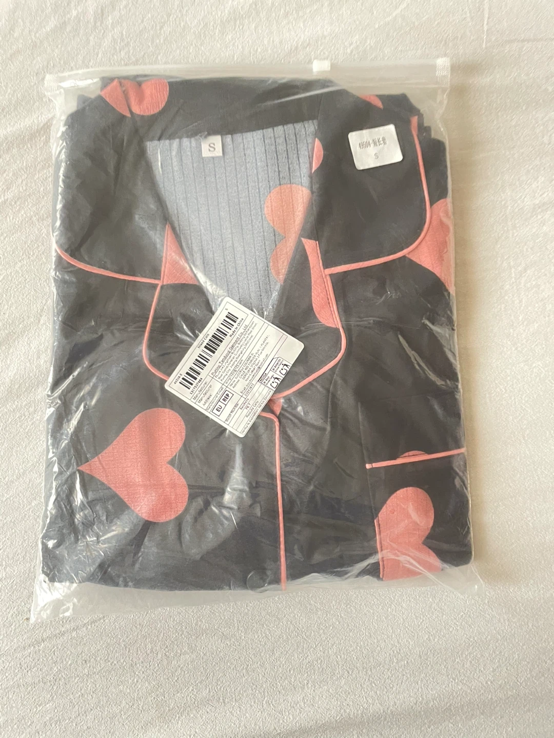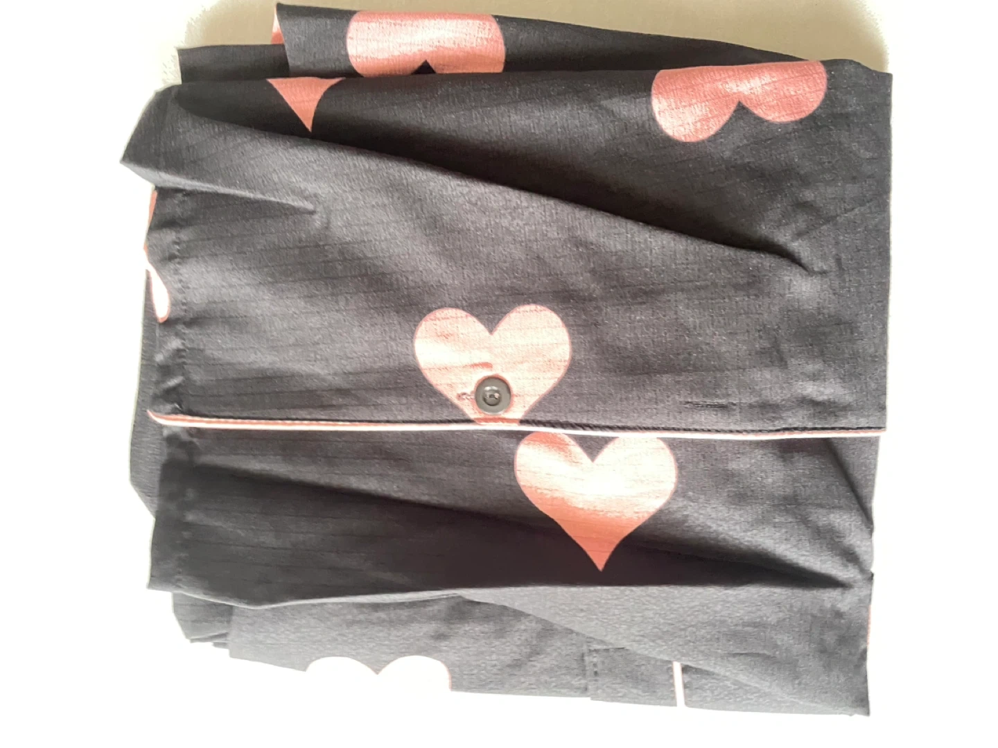 Comfy black pajama set with a cute pink heart pattern. Includes a button-up top and elastic waist pants. Size is small.