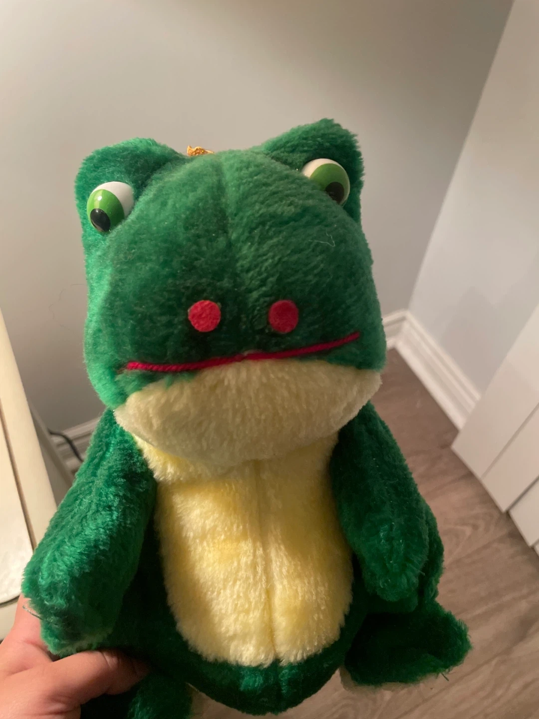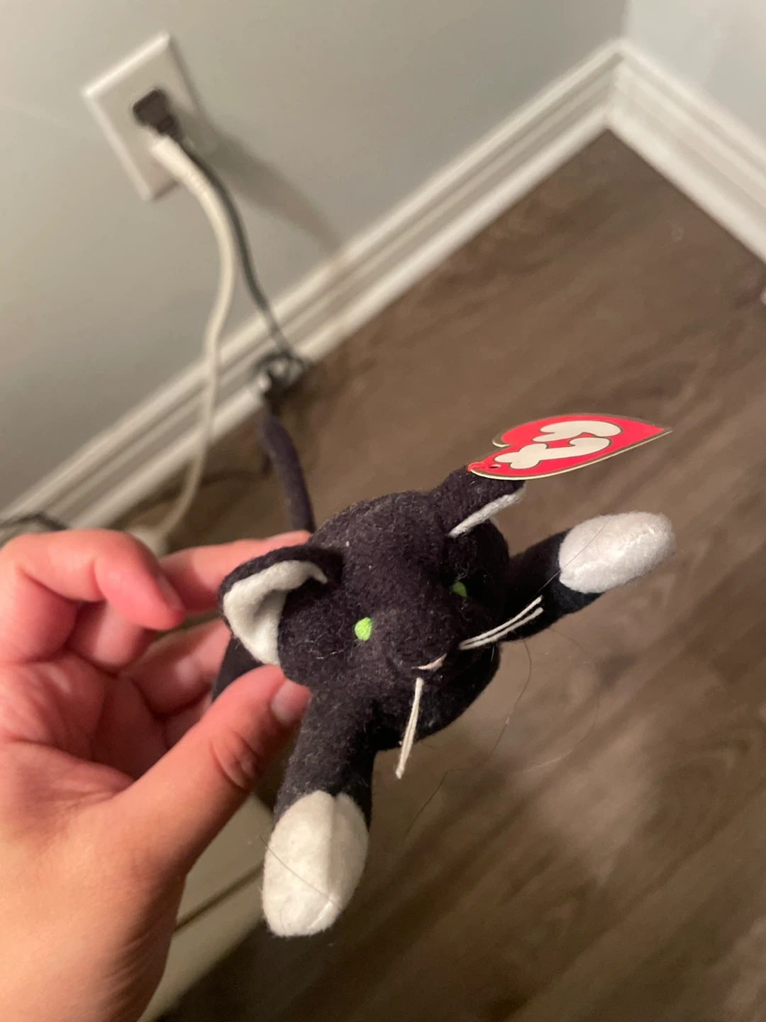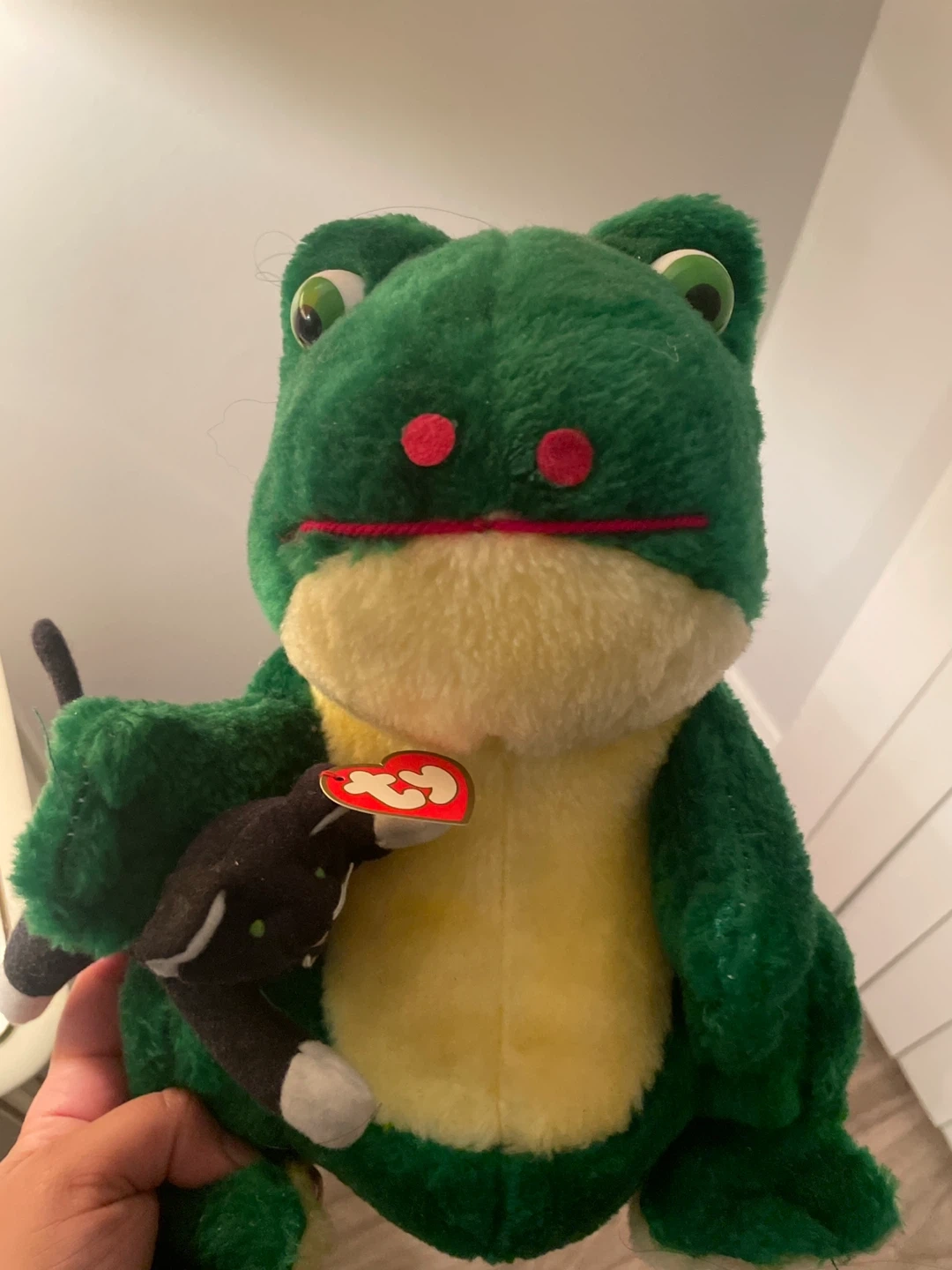 A collection of two plush toys, featuring a Ty Beanie Babies black cat and a green frog. These are collectible plush toys.