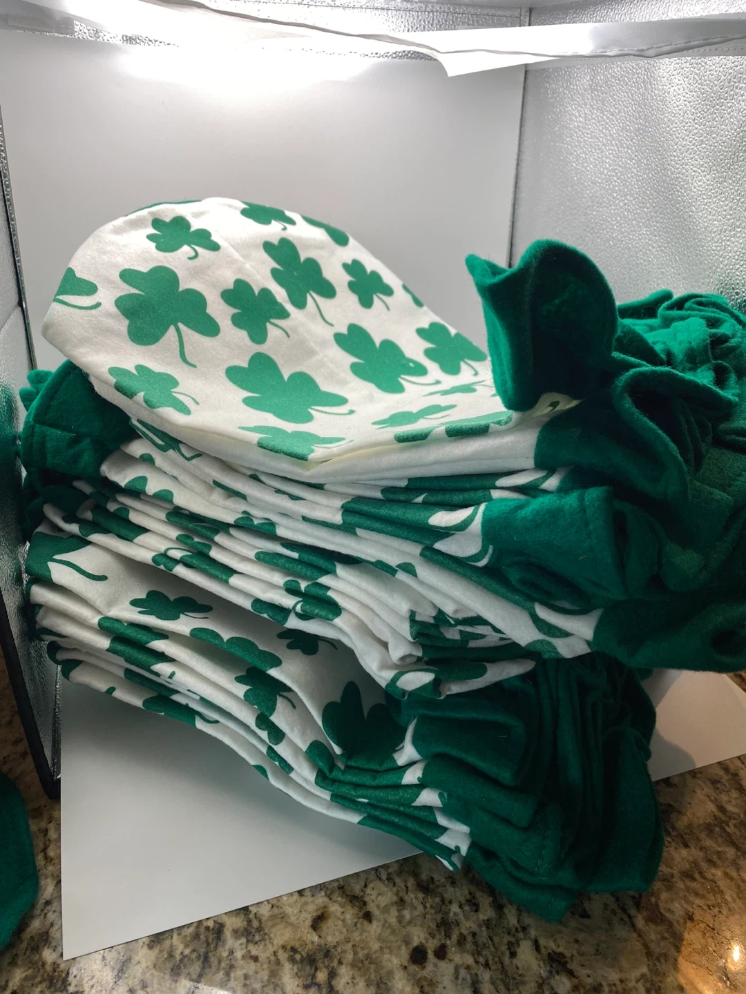 Also available, a stack of green and white shamrock-patterned cloth top hats.