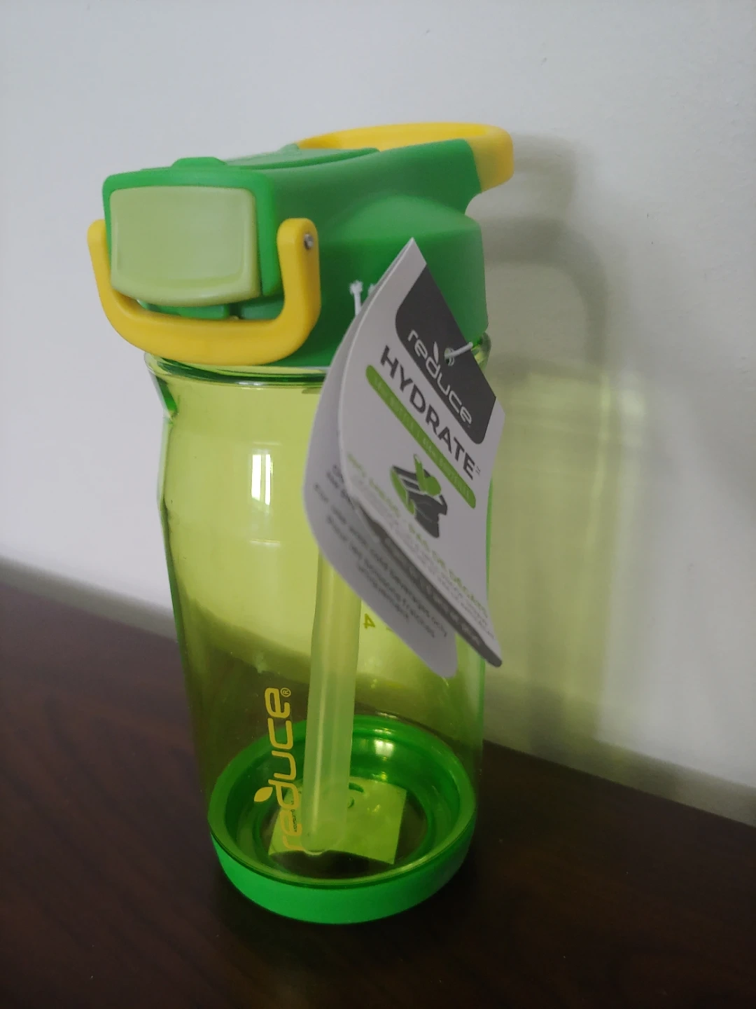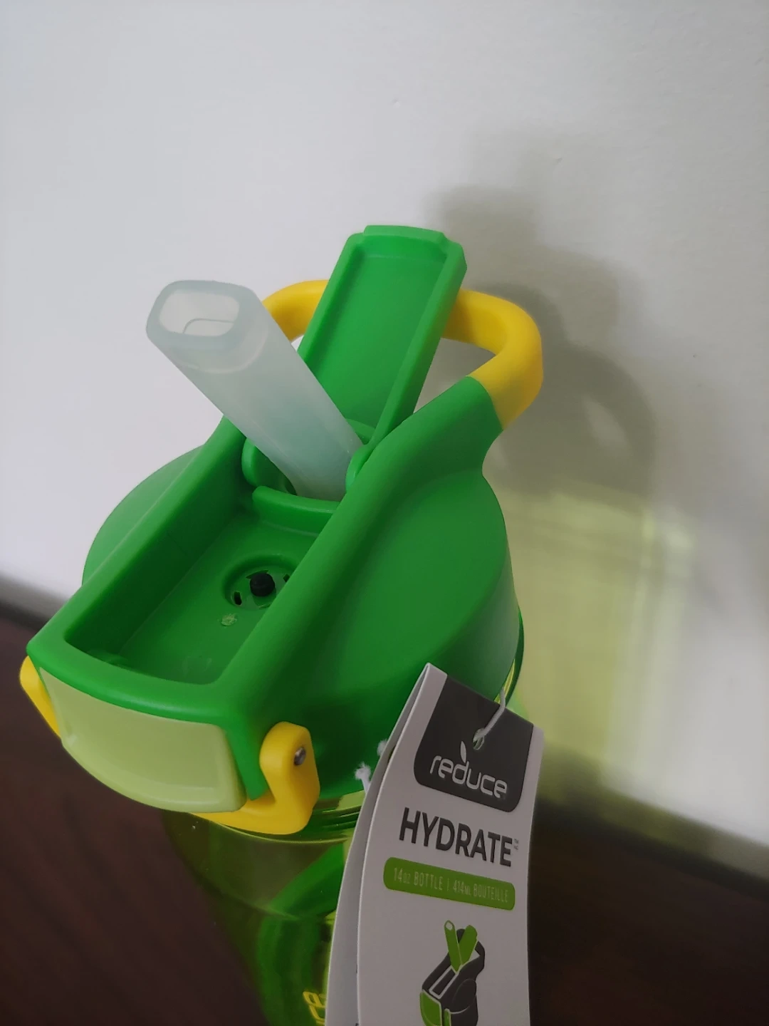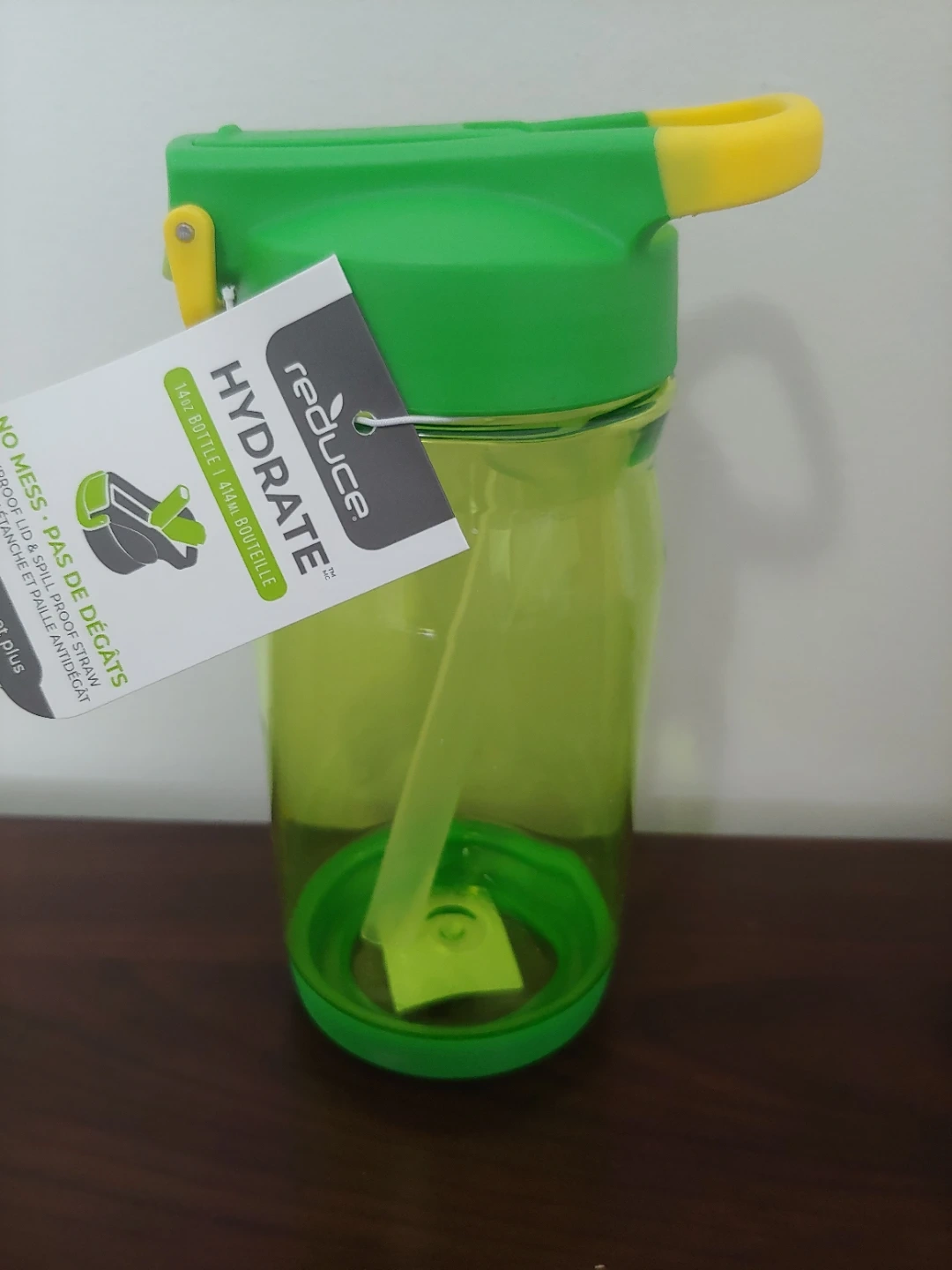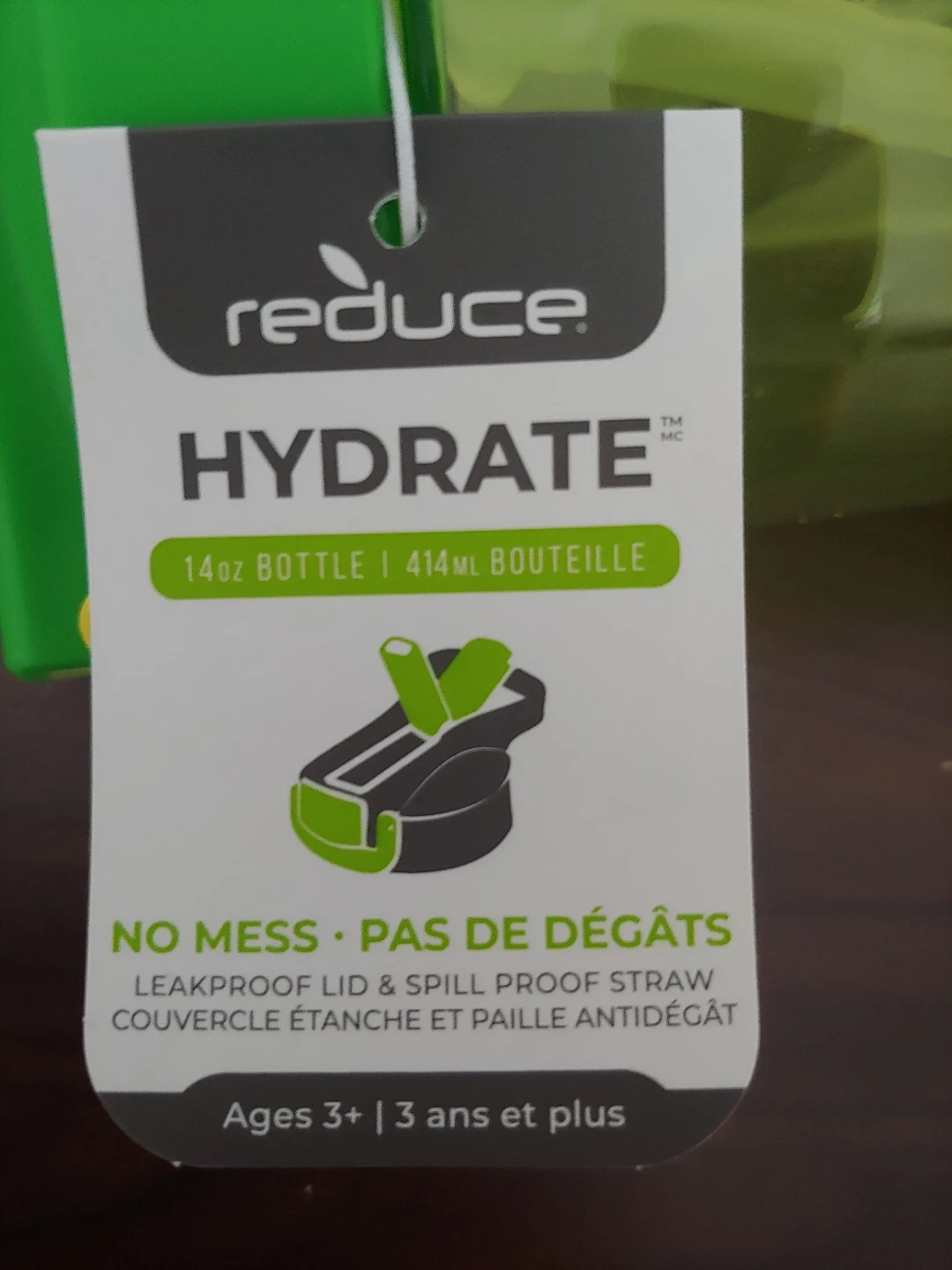 New Reduce Hydrate 14 oz bottle with a leakproof lid and spill-proof straw. It's great for kids ages 3 and up. The bottle is made of plastic.