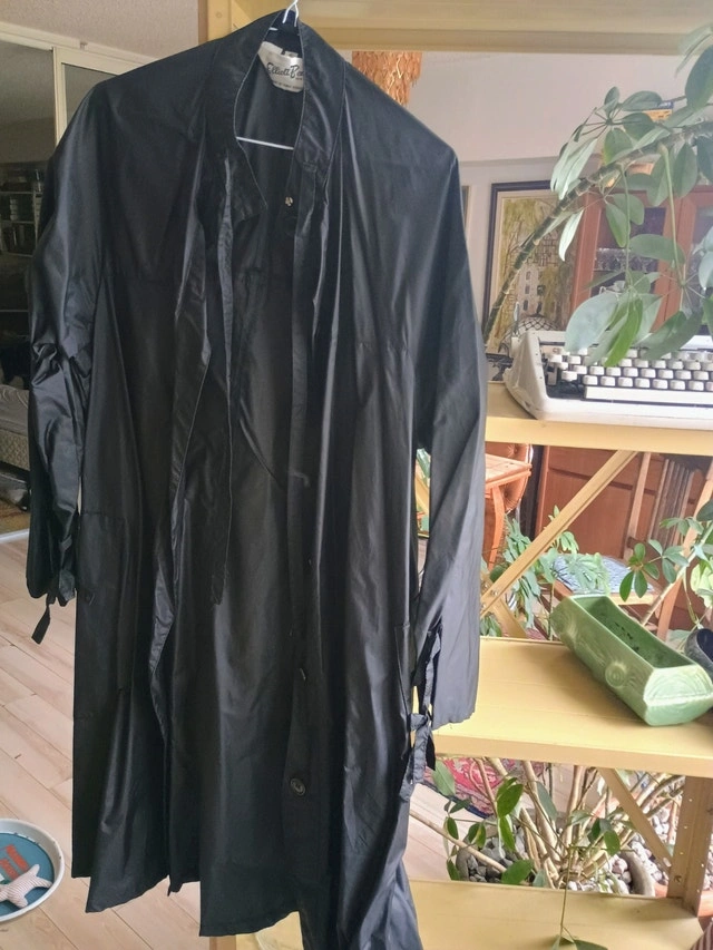 Gorgeous nylon Mod 1960s style black rain coat. Lovely detailing, slight bell/swing shape. Billed as size 6, but very roomy, fits up to XXL.