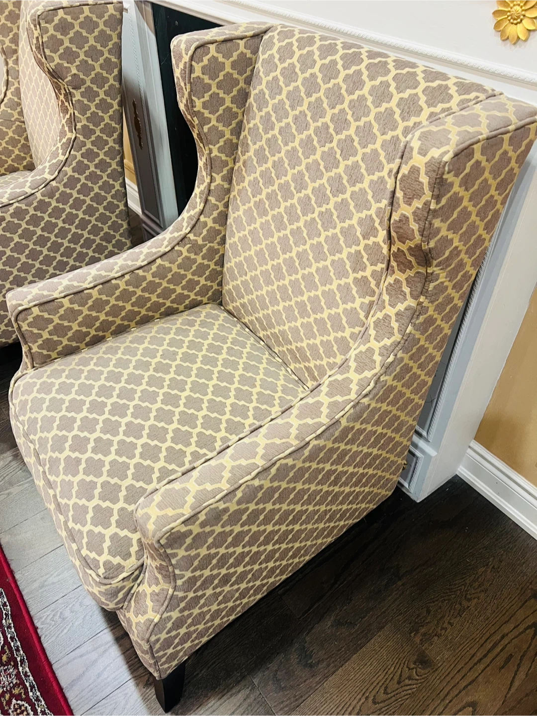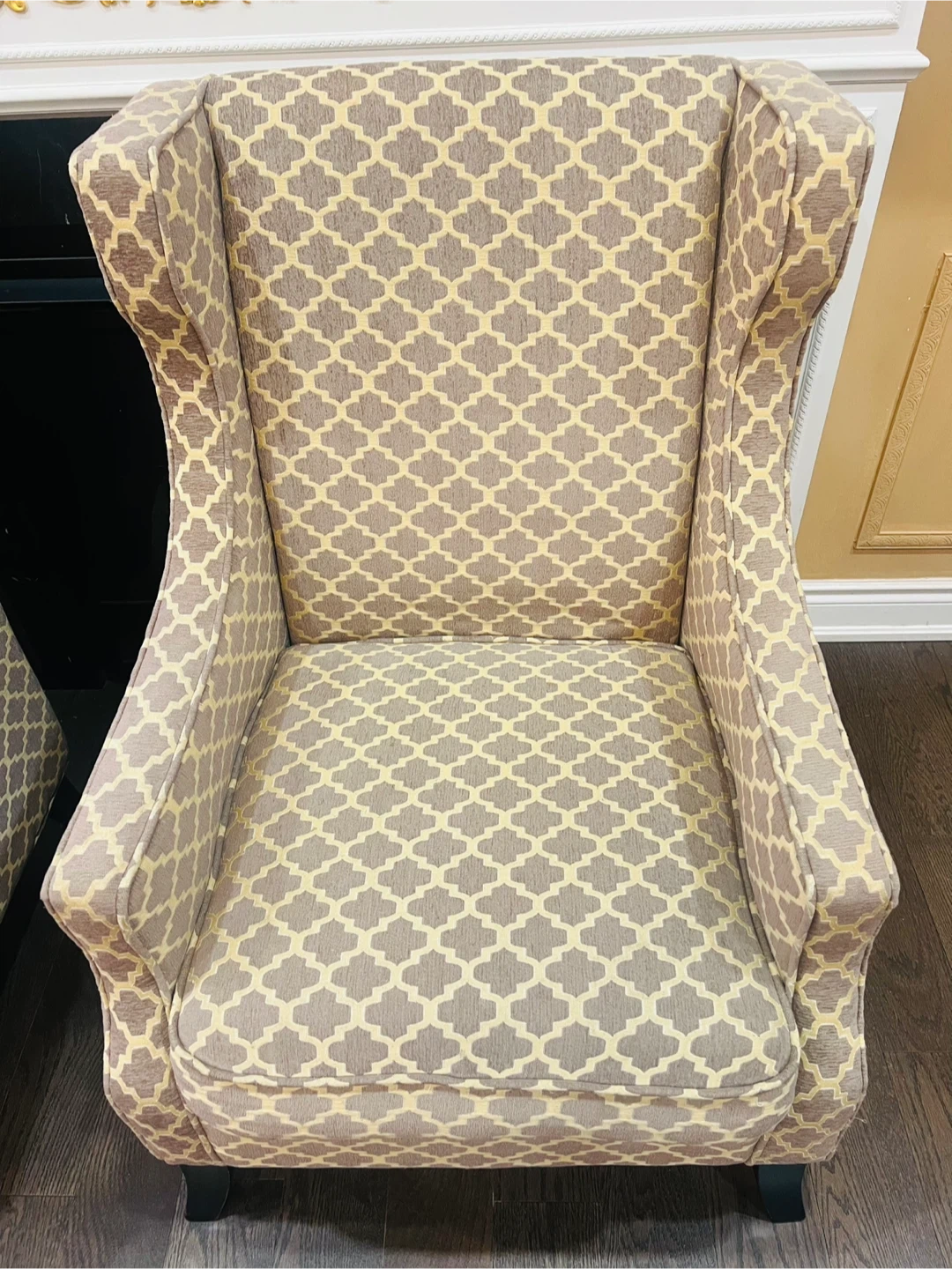 A pair of stylish accent chairs with a grey and beige geometric pattern. These wingback chairs offer a comfortable seating option. Upholstered in fabric with dark wooden legs.