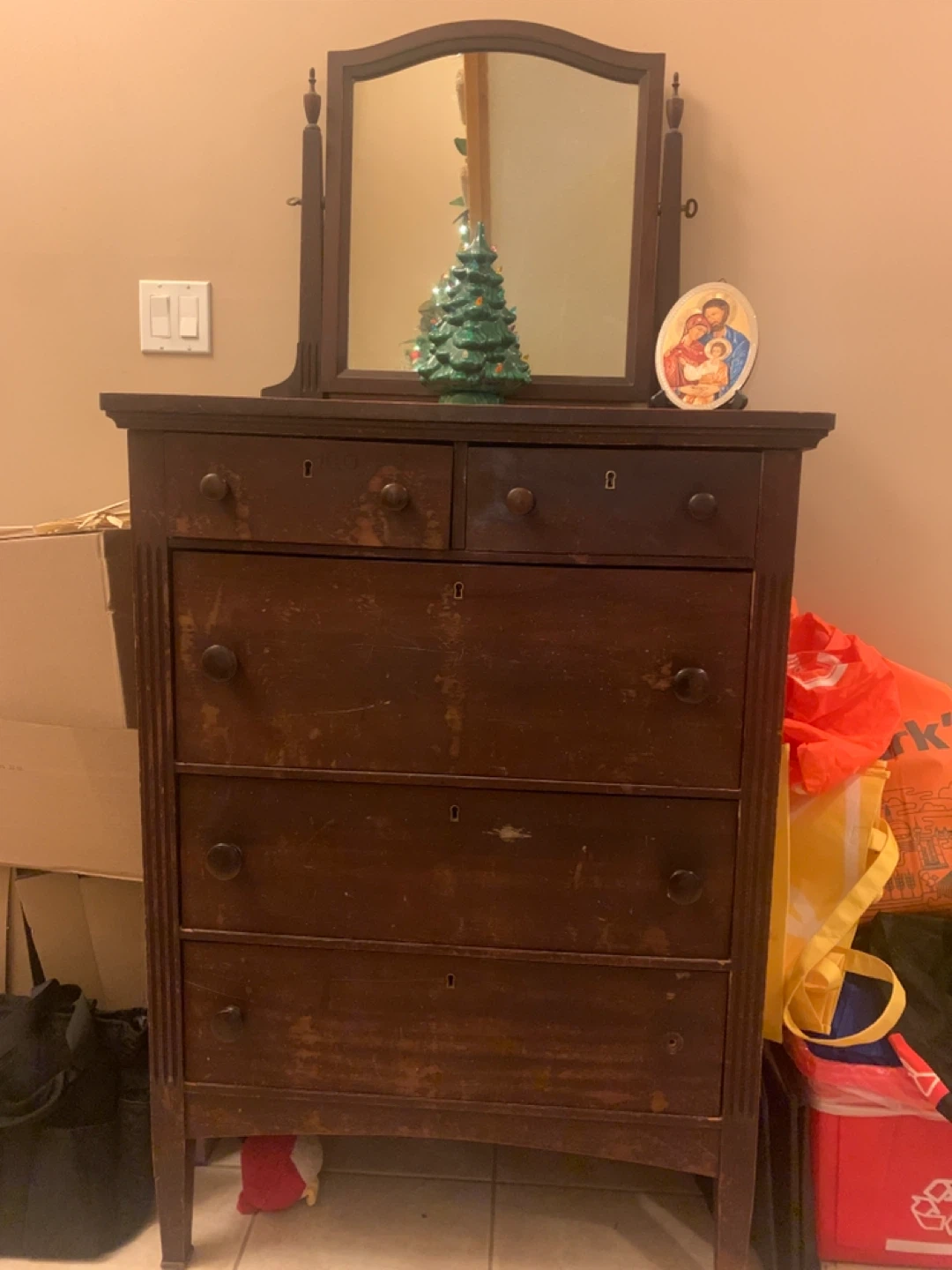 Here's a charming antique wooden dresser with a mirror. It features multiple drawers for ample storage. It has a lovely, classic look that would fit well in any home!