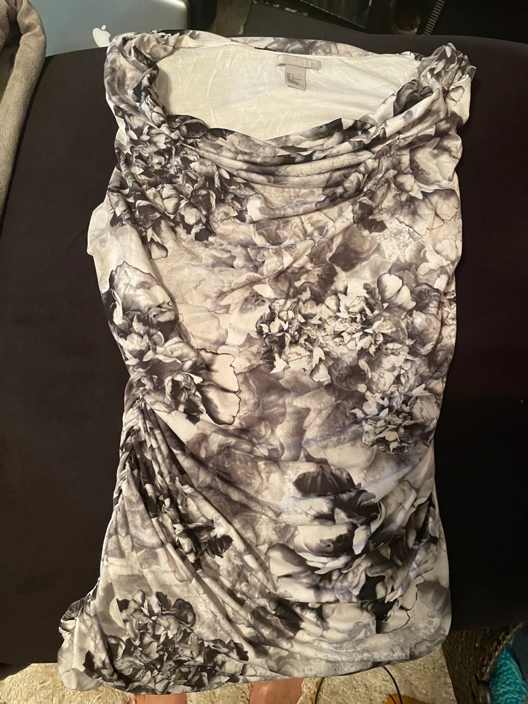 H&M women's top with a draped neckline and ruched detailing. It's a size large with a black and white floral print. Fabric is soft and stretchy. Looks great with flowy skirts in summer