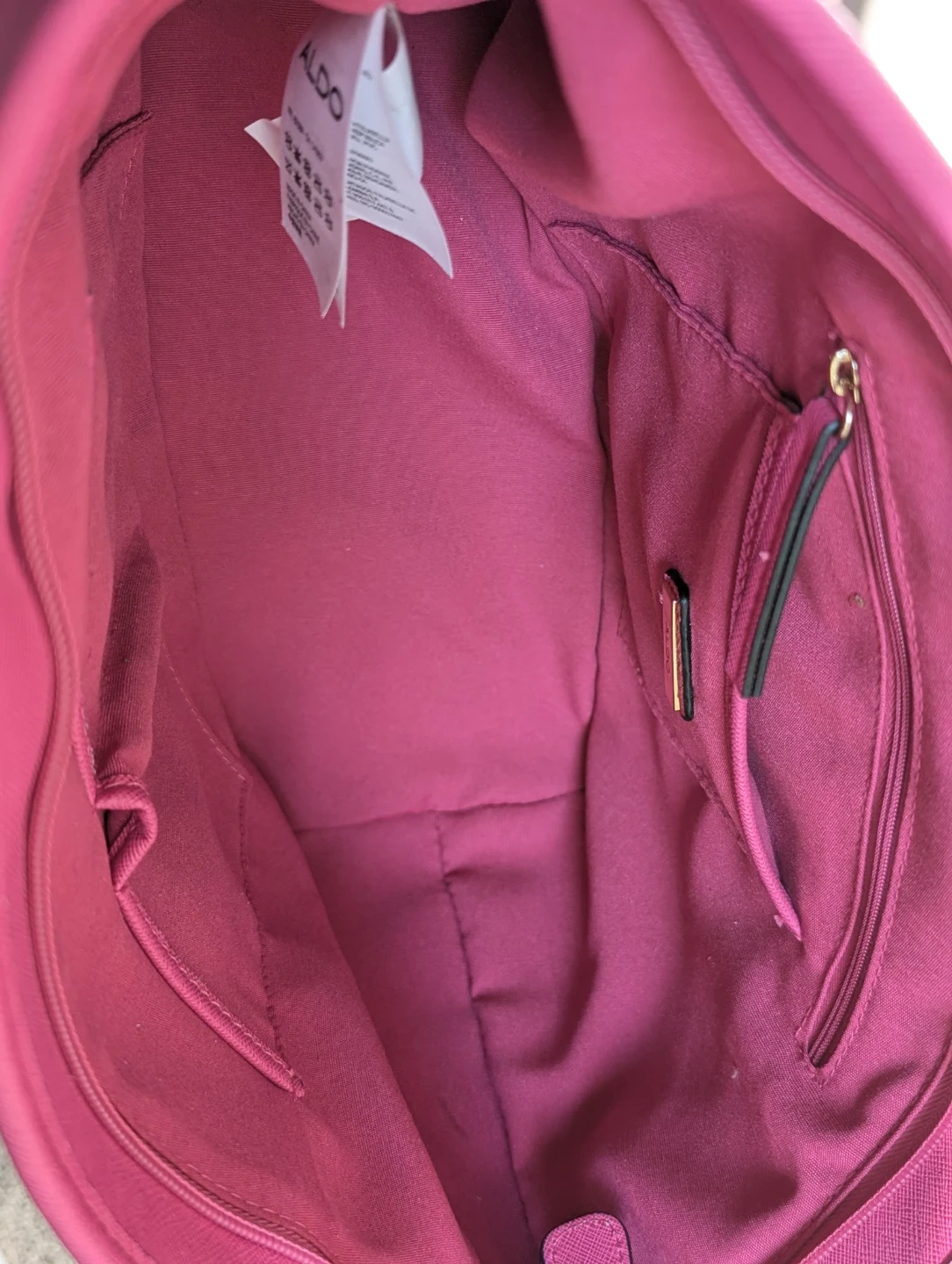 This beautiful Aldo handbag is in perfect, new condition. It has adjustable straps, full length zipper closure, a flat bottom, and additional interior pockets. It also has a lovely gold Aldo tag buckled around the strap.