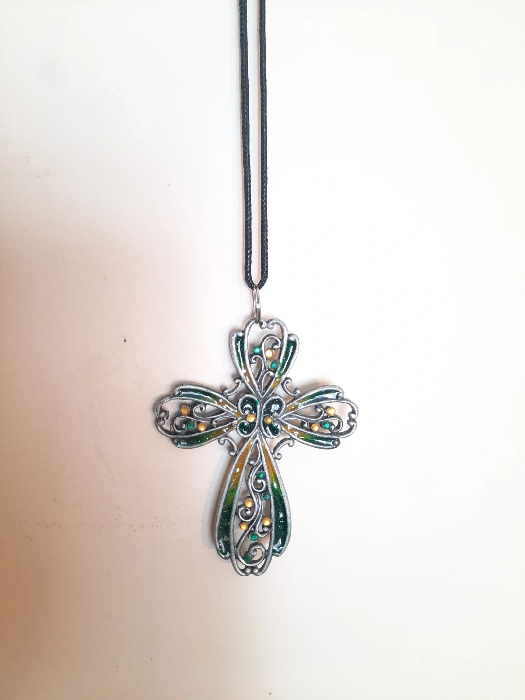 NEW epoxy corded stained glass look cross necklace, car or wall charms. Selling for $10 each. Available in 3 styles. The crosses are 4 inches high by 3 inches wide and cord length can be adjusted. Decorative cross ornament features intricate metalwork with colorful enamel accents. It's designed to hang and add a touch of style.Pick up in N.Bowmanville or may be able to meet depending on location. Please see my other ads for more decor items for sale.