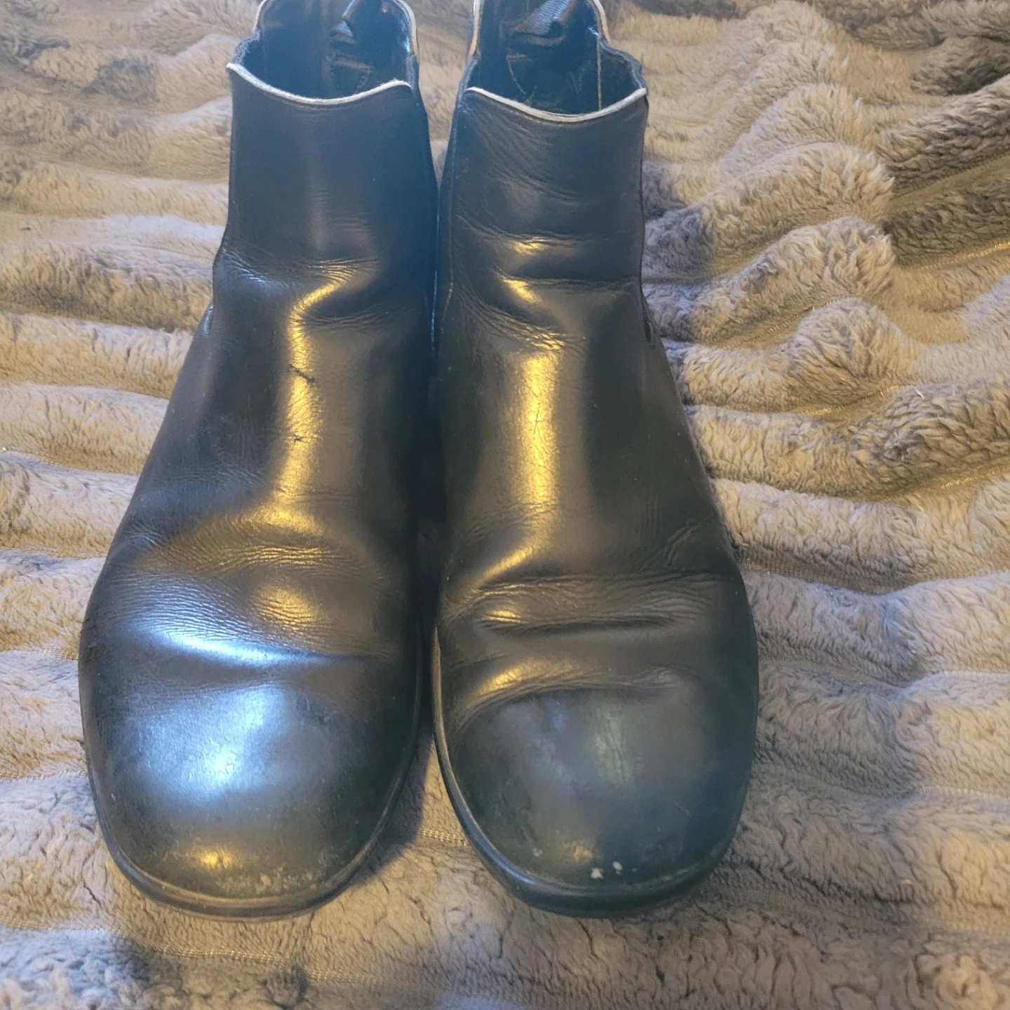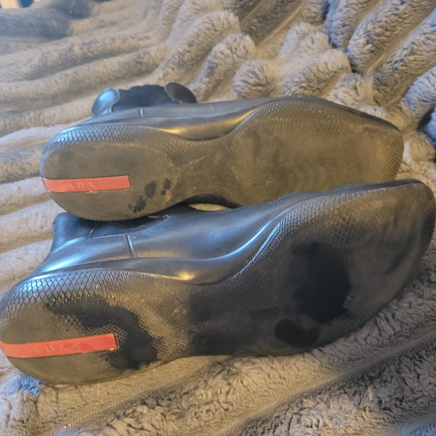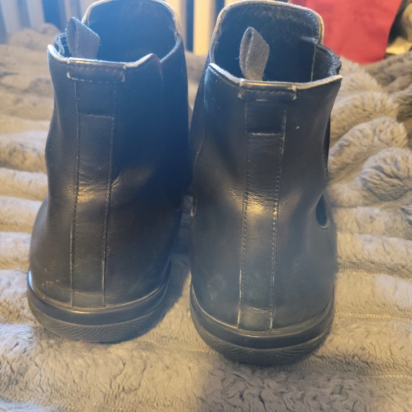 These are stylish black leather Chelsea boots from Prada. They feature elastic side panels for easy wear. Made with quality leather and a durable sole. Well loved but lots of life left...Prada 8 = US 9