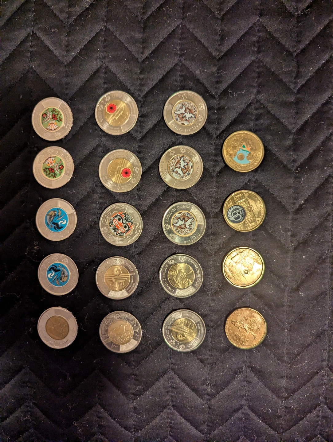 Collection of Canadian toonies and loonies of various special editions, some duplicates are included.