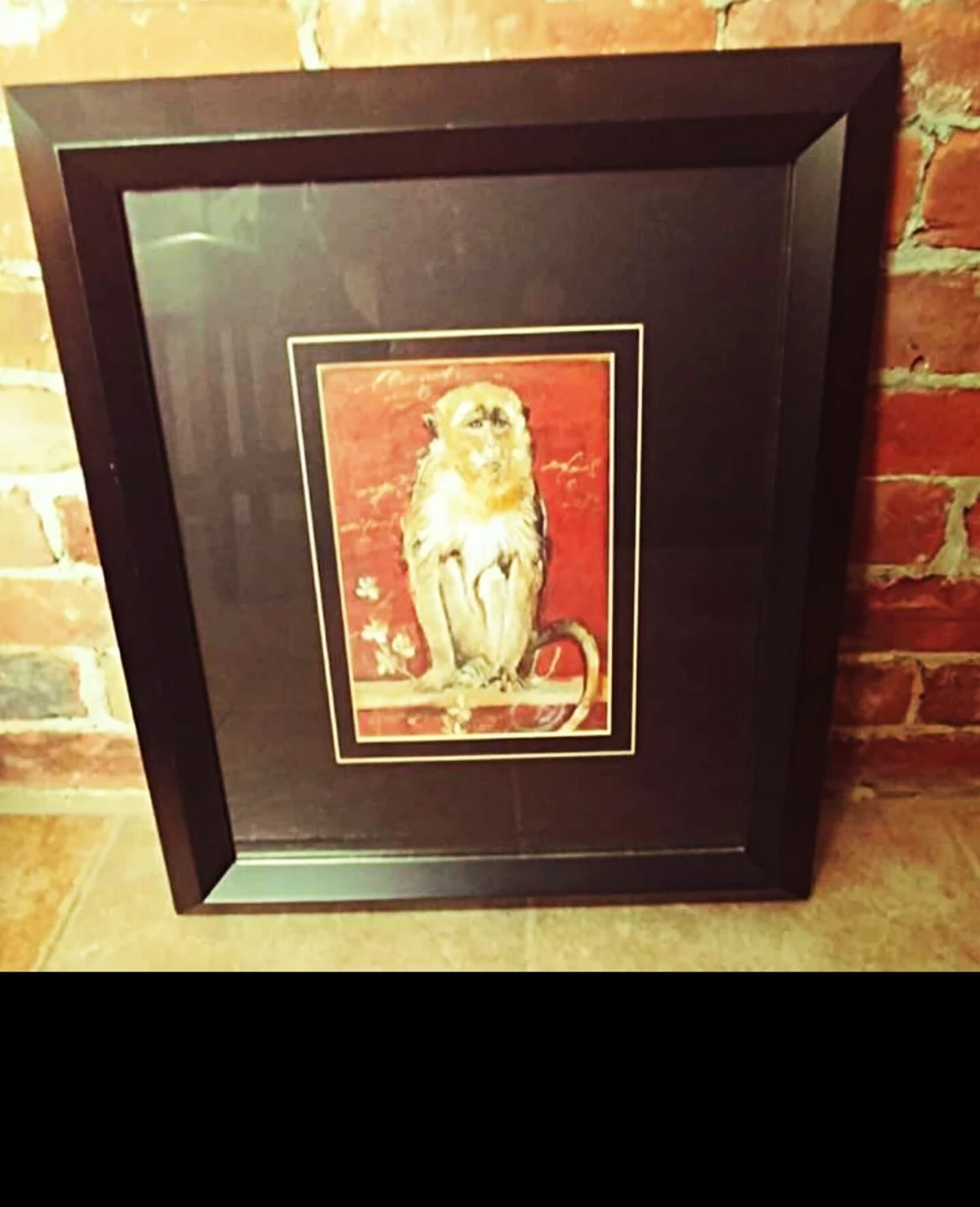 Framed print featuring a monkey on a red background. The artwork is housed in a dark wood-style frame. It's a nice accent piece for any room.