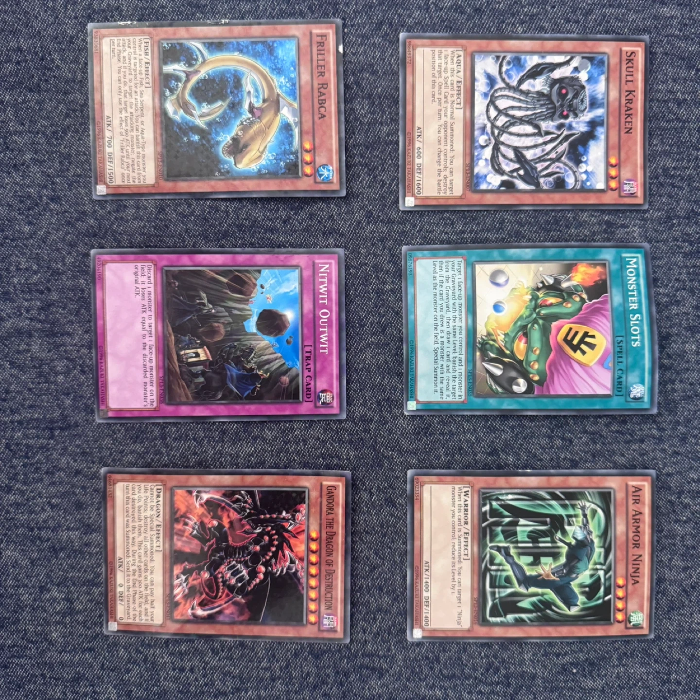 180Selling a lot of 6 Yu-Gi-Oh! trading cards. Includes: - Friller Rabca (shiny, poor condition on backing) - Skull Kraken - Nitwit Outwit - Monster Slots - Gandora the Dragon of Destruction (shiny) - Air Armor Ninja 7$ or best offer