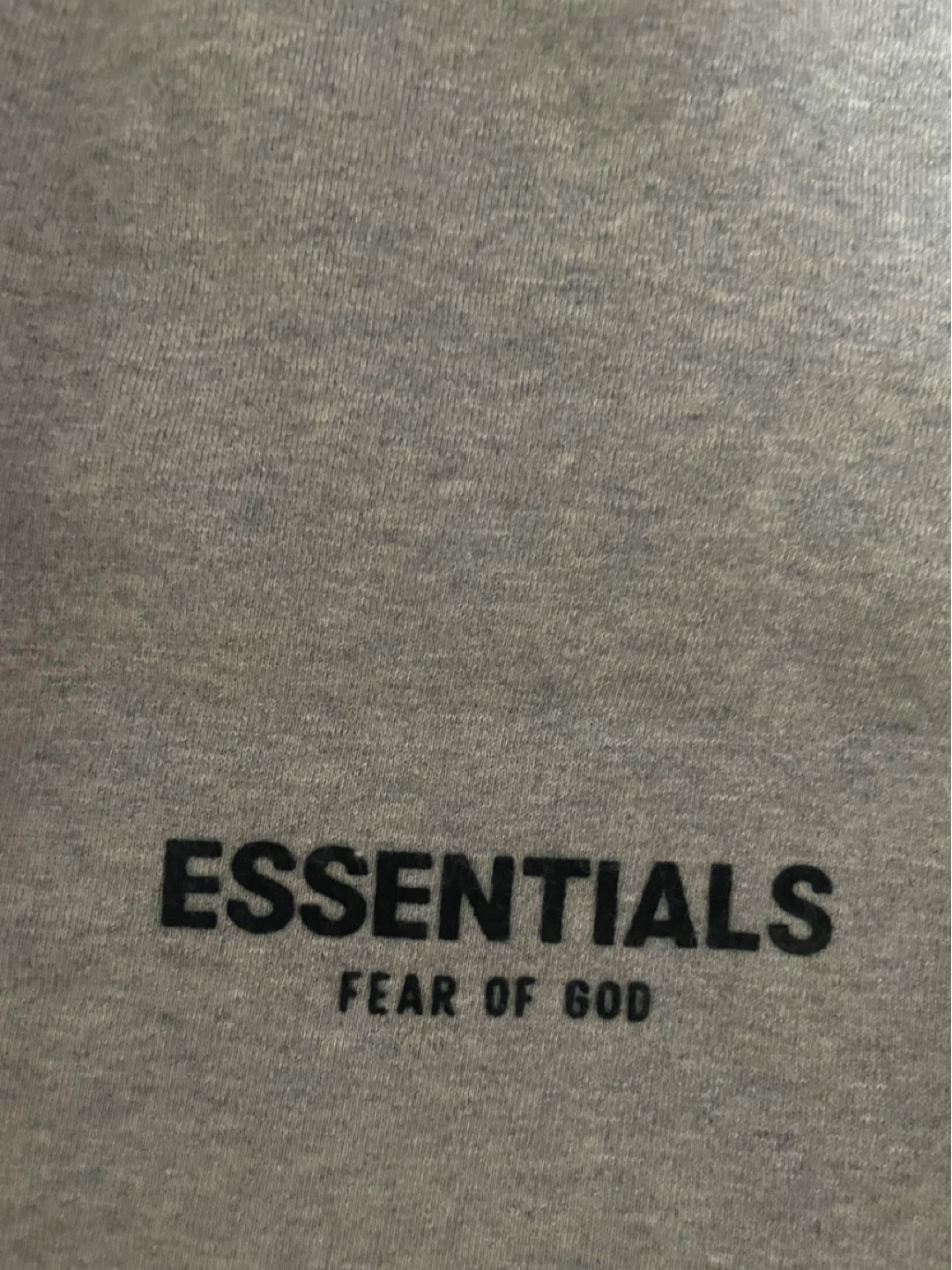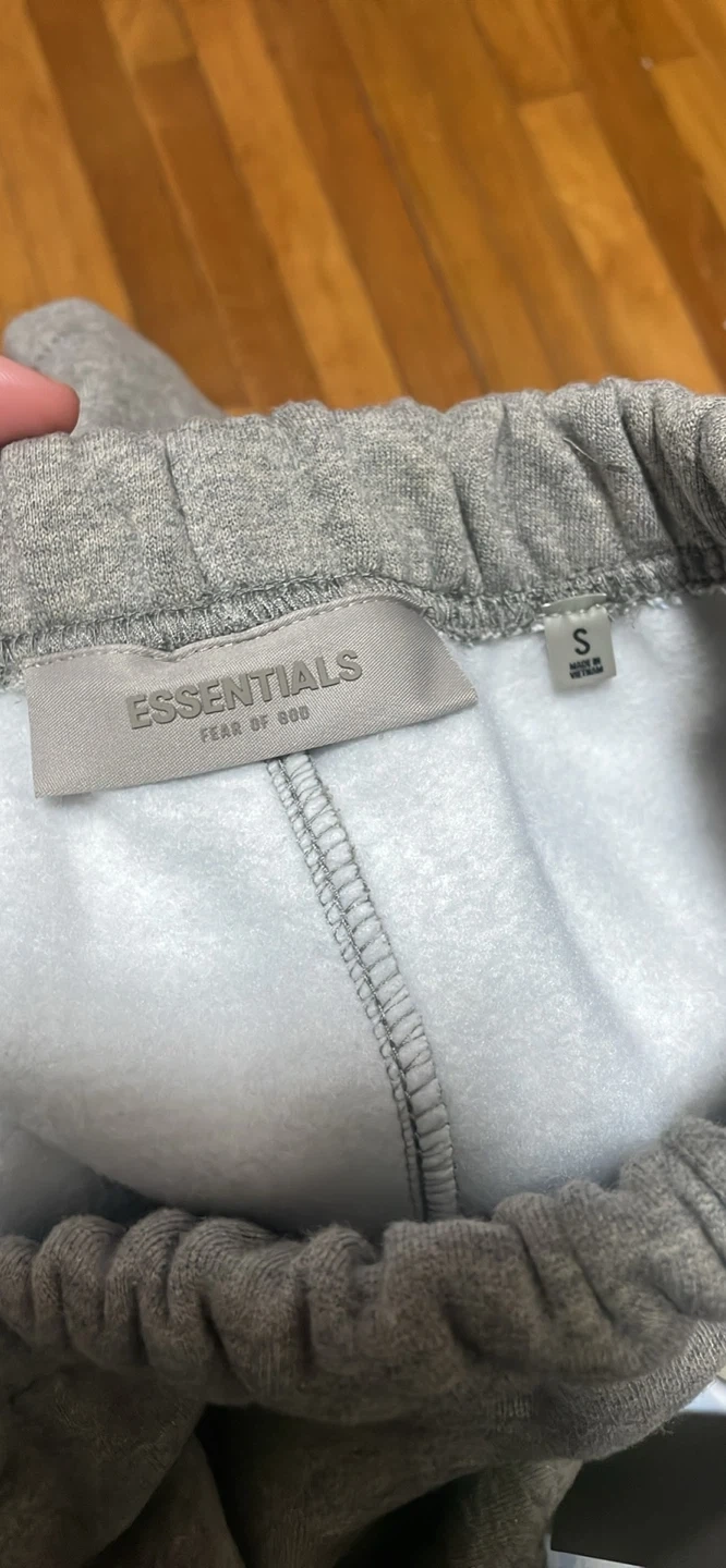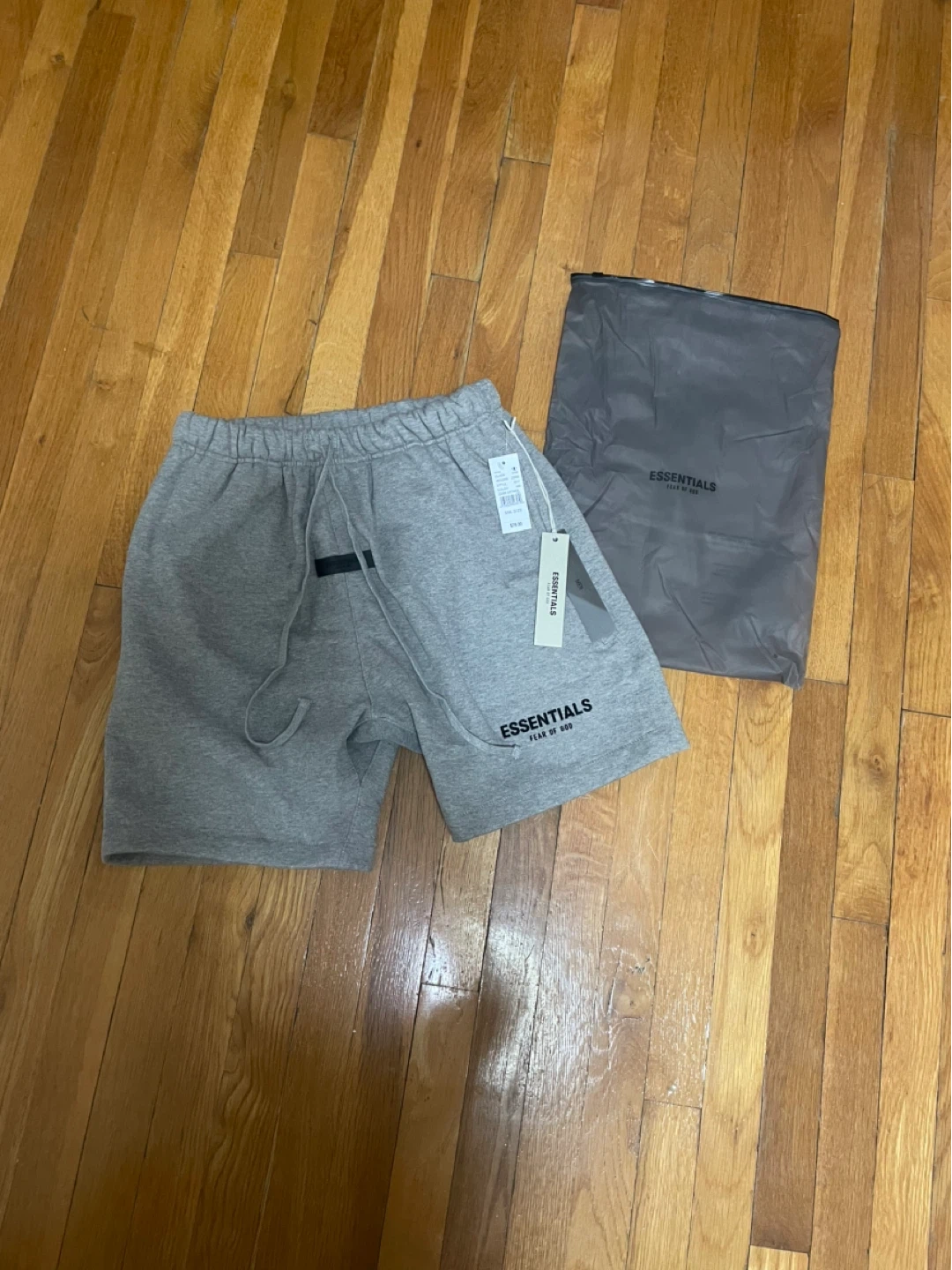 These are Fear of God Essentials sweat shorts in a grey "Dark Oatmeal" color. They're a size S and include the original tags and bag. Cotton blend material.