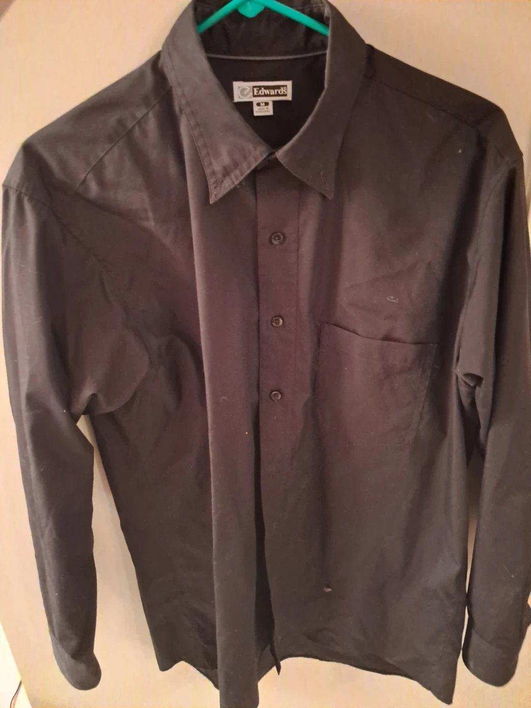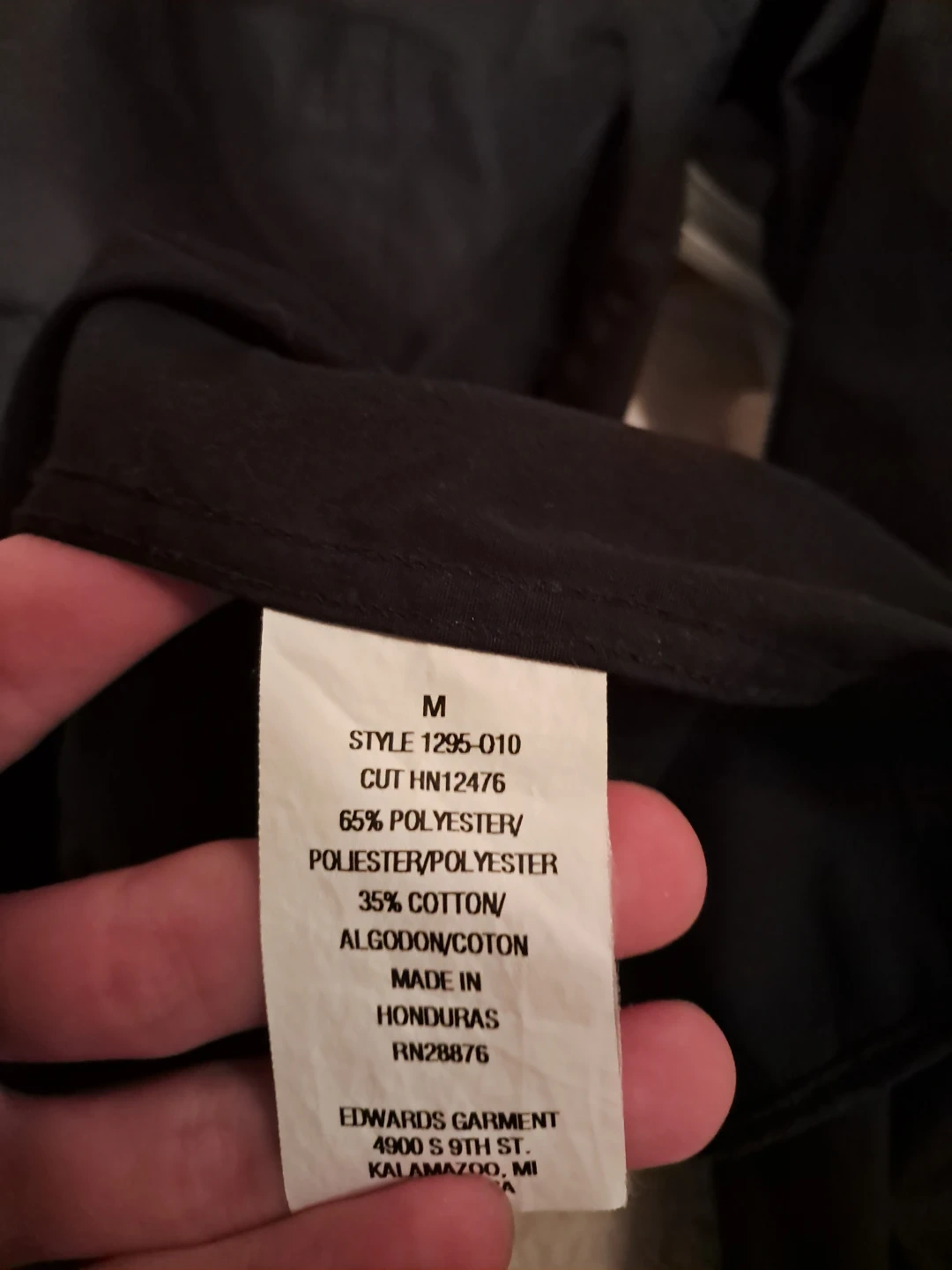 - A medium black Edwards Garment shirt, style 1295-010, made of 65% polyester and 35% cotton.
