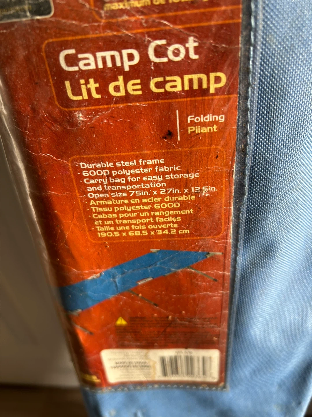 Folding camp cot with a durable steel frame and 600D polyester fabric. It comes with a carry bag for easy storage and transportation. Open size is 75in x 27in x 13.5in.