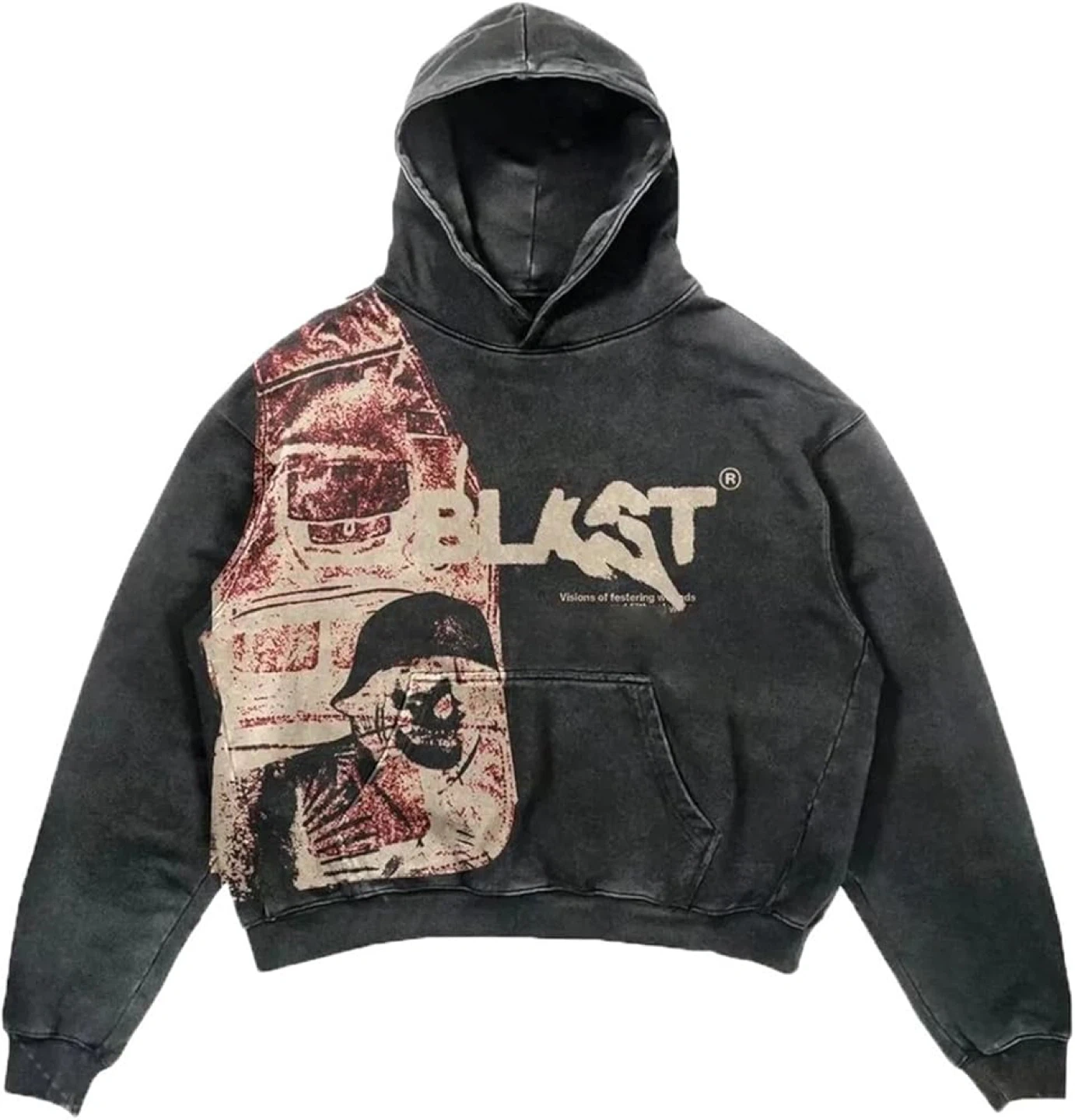 This BLAST hoodie features a distressed charcoal wash with a graphic print on the front. It's a pullover style with a front pocket and hood. Made from comfortable fabric.