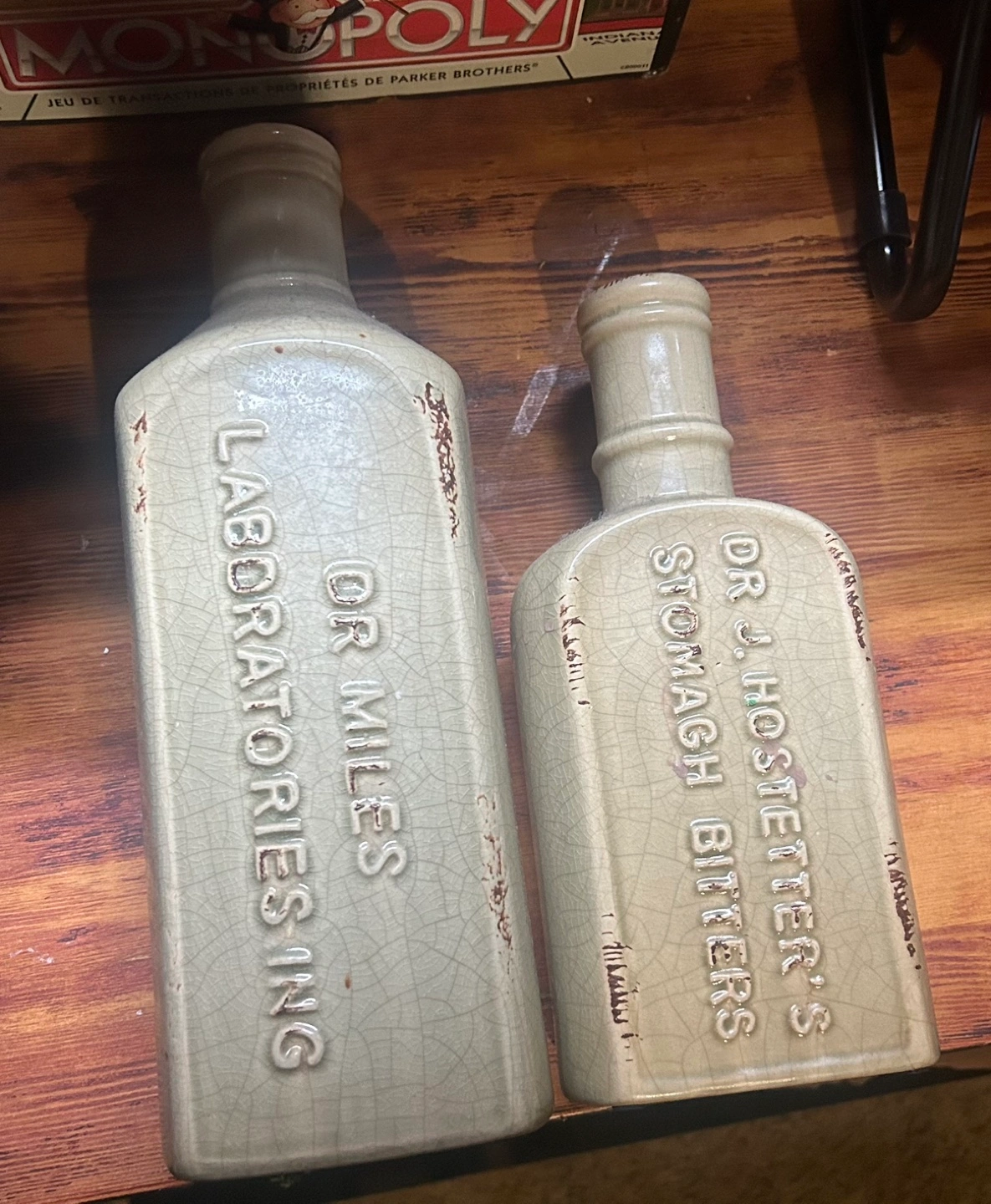 Two decorative bottles. Grey stoneware. One labelled Dr Miles Laboratories. Other labelled Dr J Hostetter's Stomach Bitters. Collectible or decorative pieces.