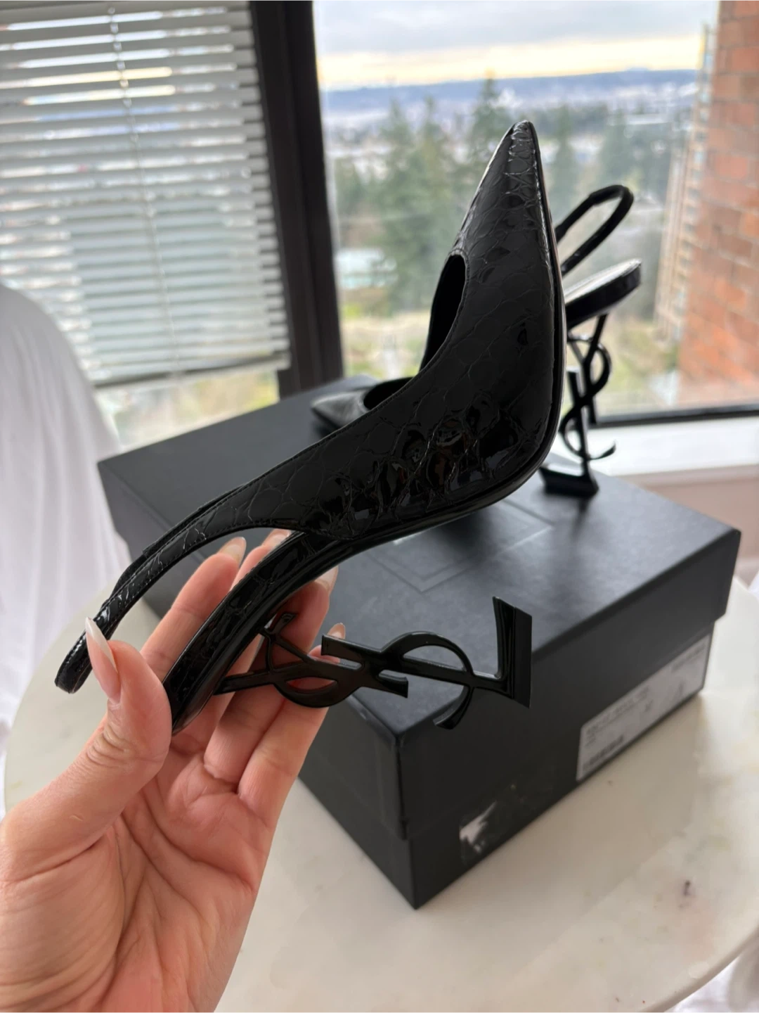 Saint Laurent black slingback heels with a croc embossed finish. Features the signature YSL heel detail. Made in Italy. Size 37.