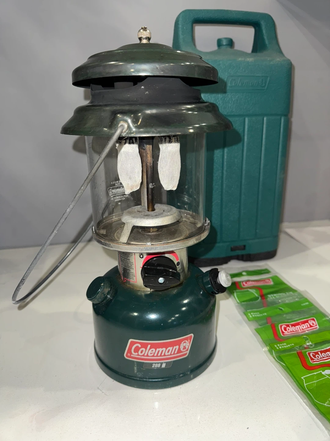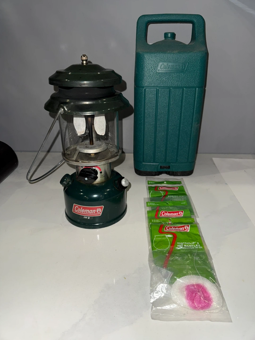 This Coleman 288 lantern comes with its original green carrying case. Also included are 4 packs of Coleman #21 string tie mantles. Fill the tank with 1.3 pints (739 mL) of naphtha and it’ll run for up to 10 hours.