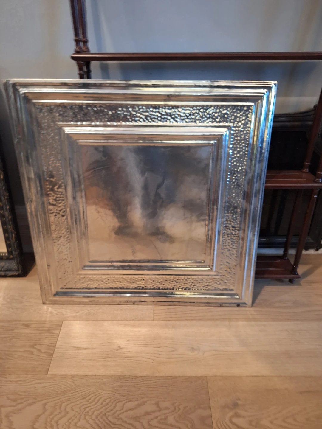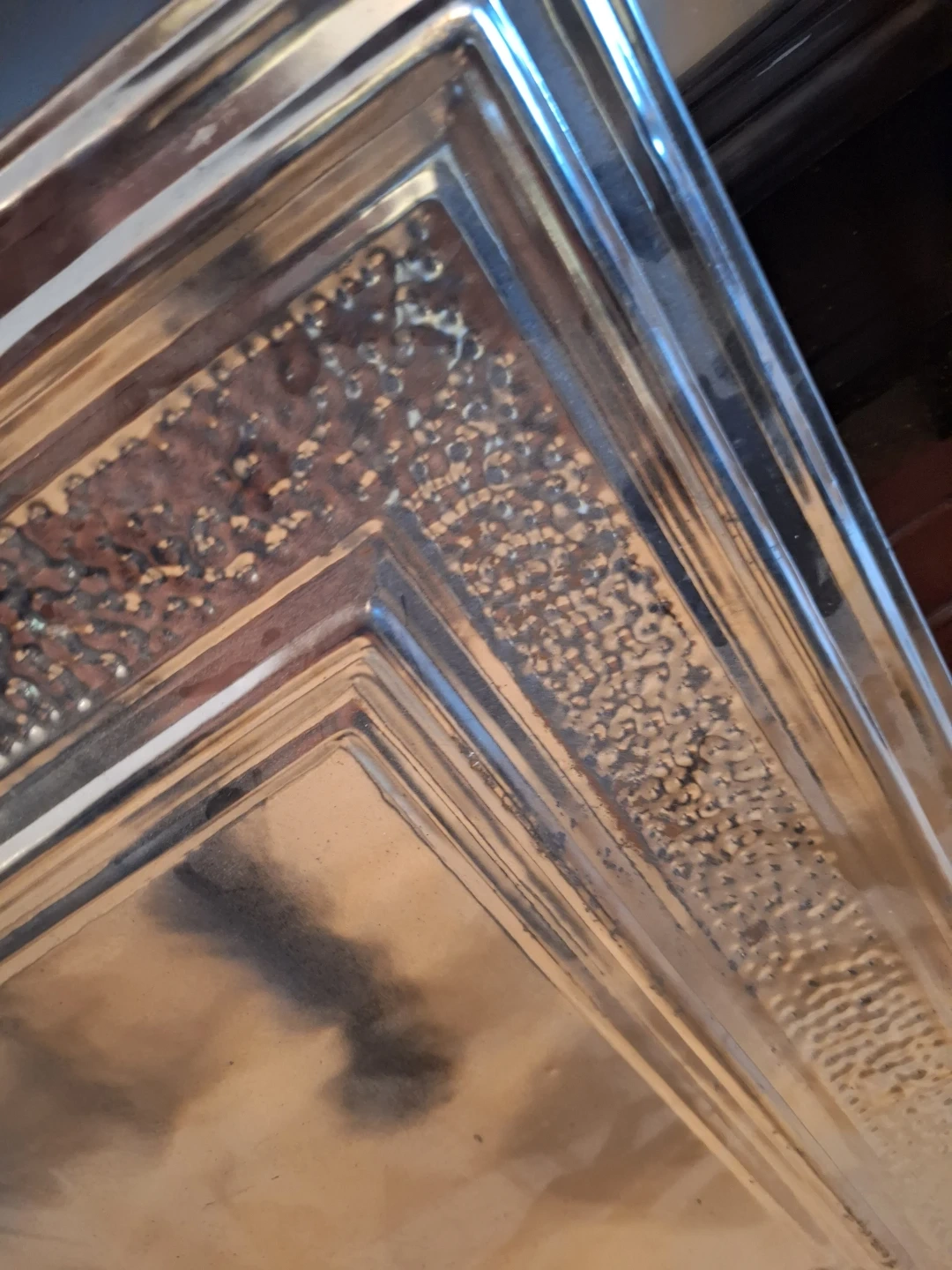 A decorative tray with a hammered border and layered centre. It's great for serving or display. The metallic finish adds a touch of elegance to any setting. Made with a sturdy metal material.