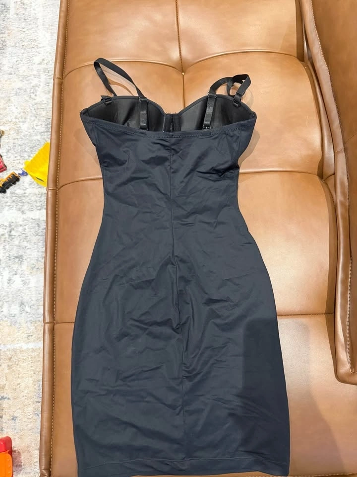 Gently used, worn only once. This sleek slip dress is perfect for layering under your favorite outfits. Its curve-hugging design creates a slimming effect. Fits sizes X-Small to Small.