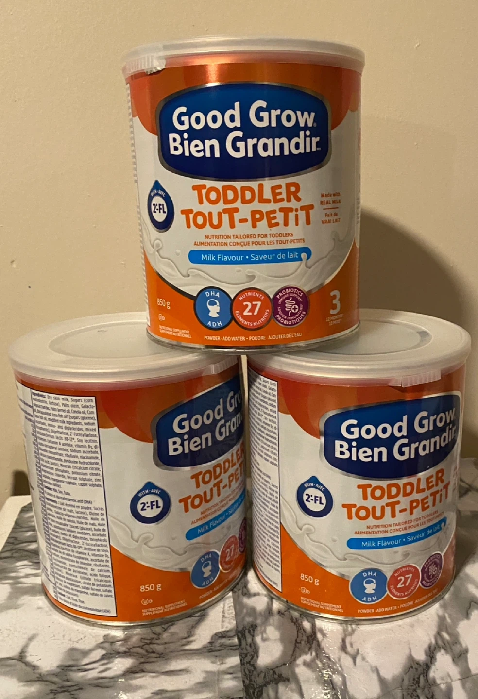 Good Grow Bien Grandir. Contains DHA, 27 nutrients and probiotics. Made with real milk. Powder for adding to water. 850g cans.