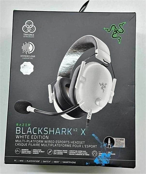 Brand new, factory sealed Razer BlackShark V2 X Xbox Gaming Headset. Features 50mm Drivers, Cardioid Mic, Lightweight design, and Comfortable Noise Isolating Earcups. Compatible with Xbox Series X, Series S, PS5, PC, and Switch via 3.5mm Audio Jack. Color: White.