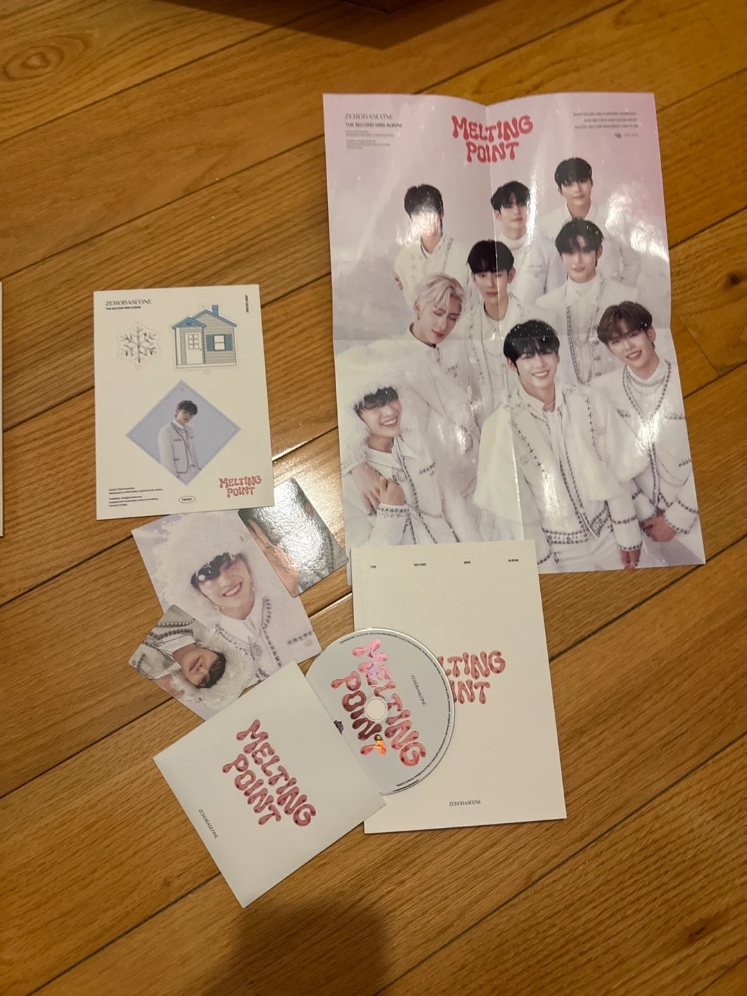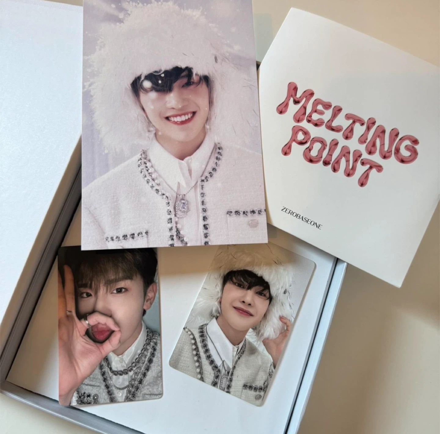 This is a set of photocards from ZEROBASEONE's 'Melting Point' release. It includes multiple photocards featuring members from the group. These are collectible items for fans. comes with the full album