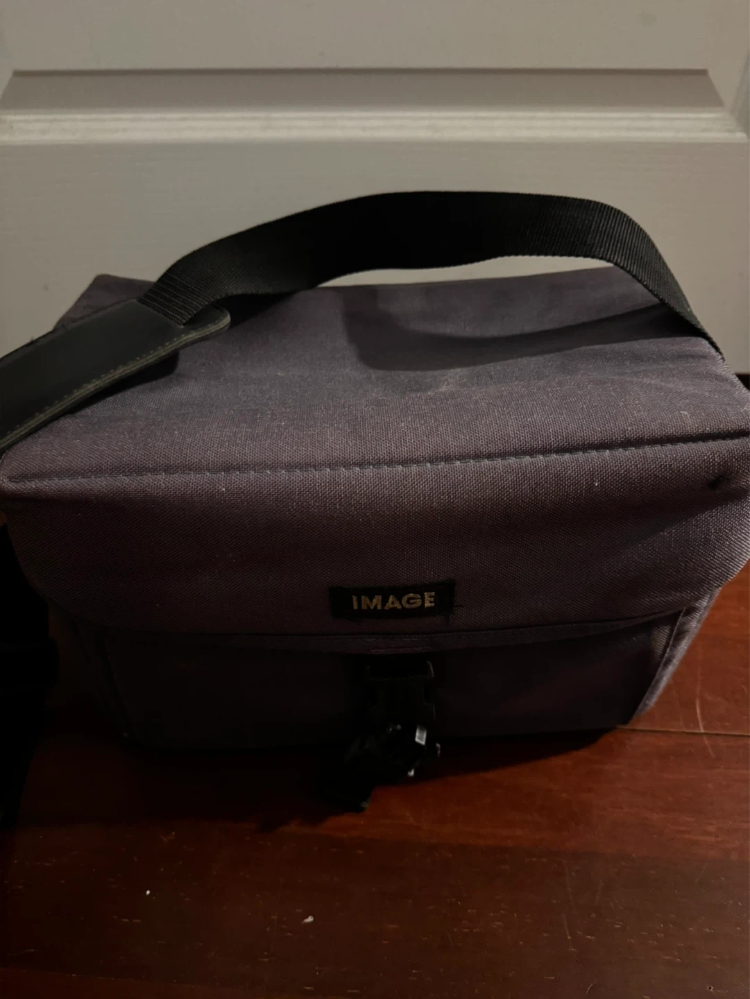 A durable fabric camera bag labelled 'IMAGE' with a padded interior and adjustable dividers. It comes with a vintage camera inside, which appears to be a manual focus model with a leatherette finish. This bag is great for protecting your camera gear!