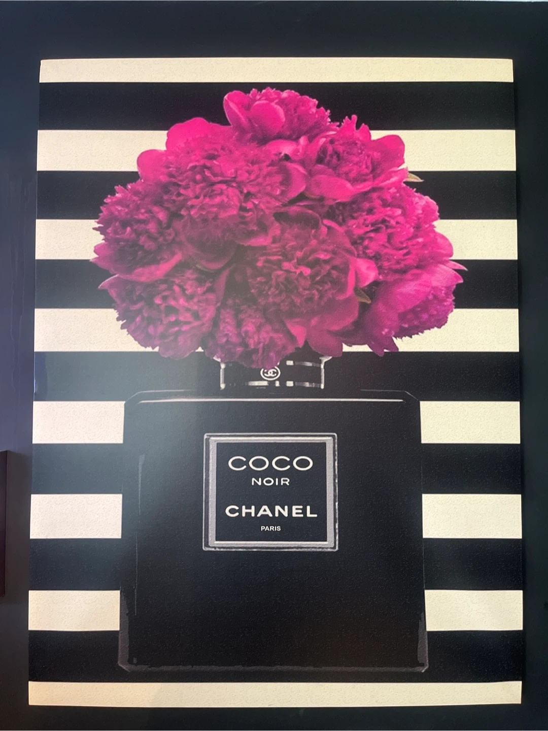 A striking piece of art featuring a Chanel Coco Noir perfume bottle with a beautiful floral arrangement on top. Great if you love the brand! It’s a very big picture width 351/2 inch X 471/2 inch