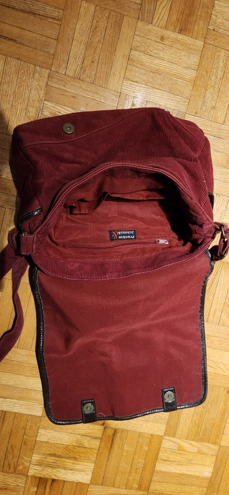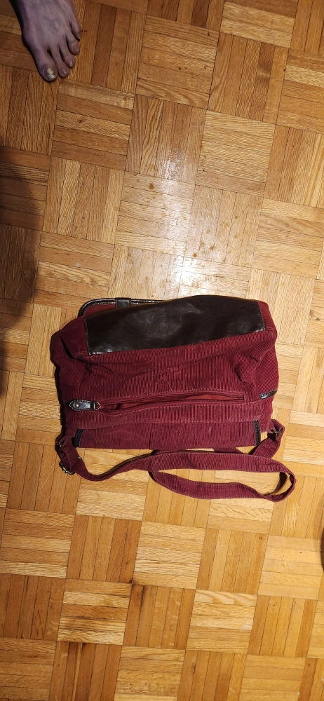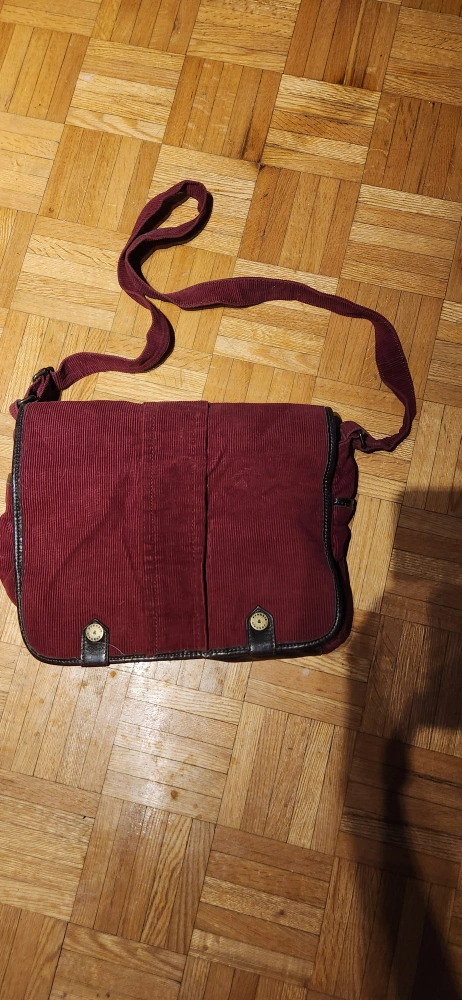 Used dark red corduroy crossbody bag. Features a brown leather accent and adjustable strap. Interior zipper pocket. Good used condition.