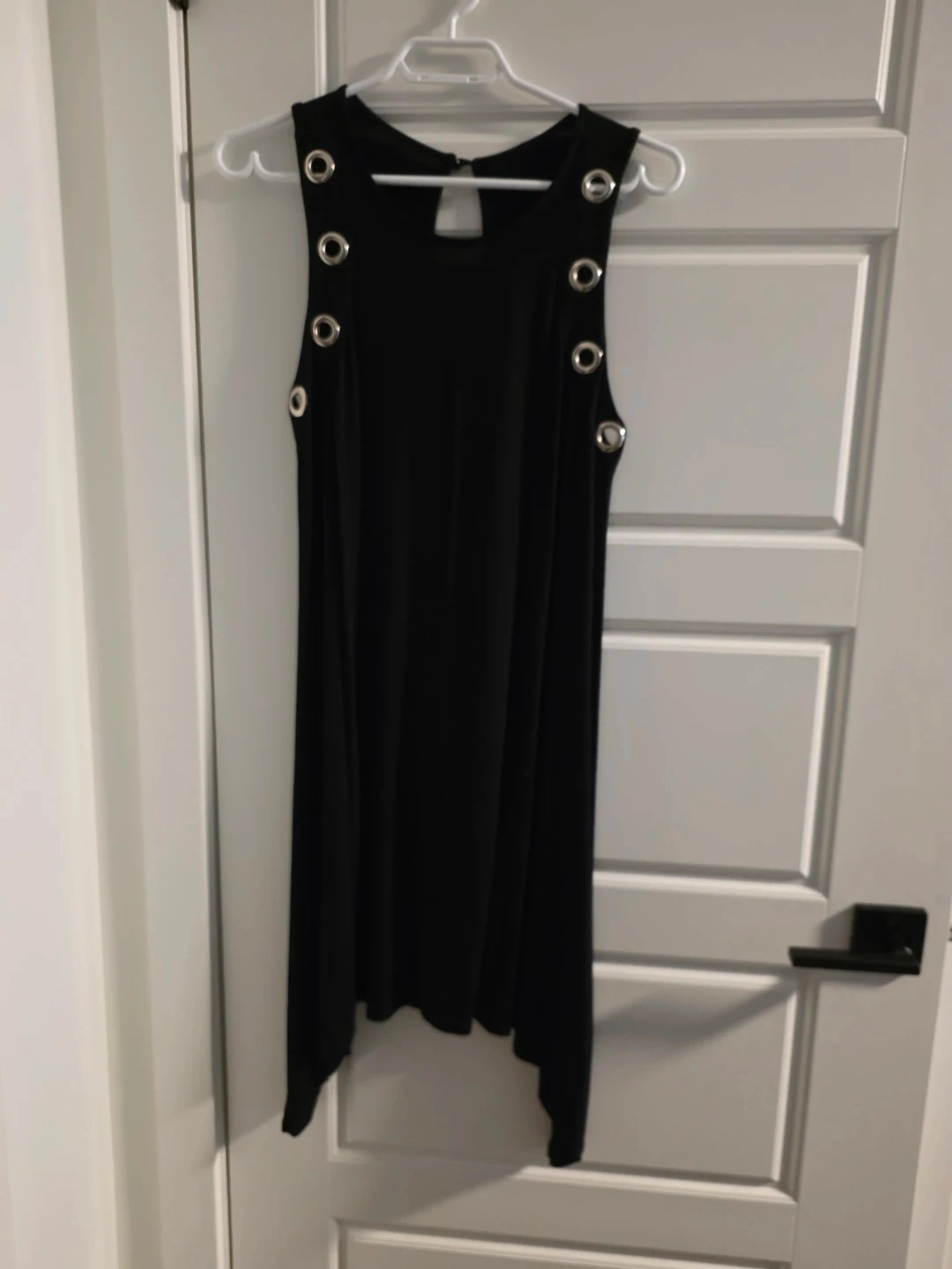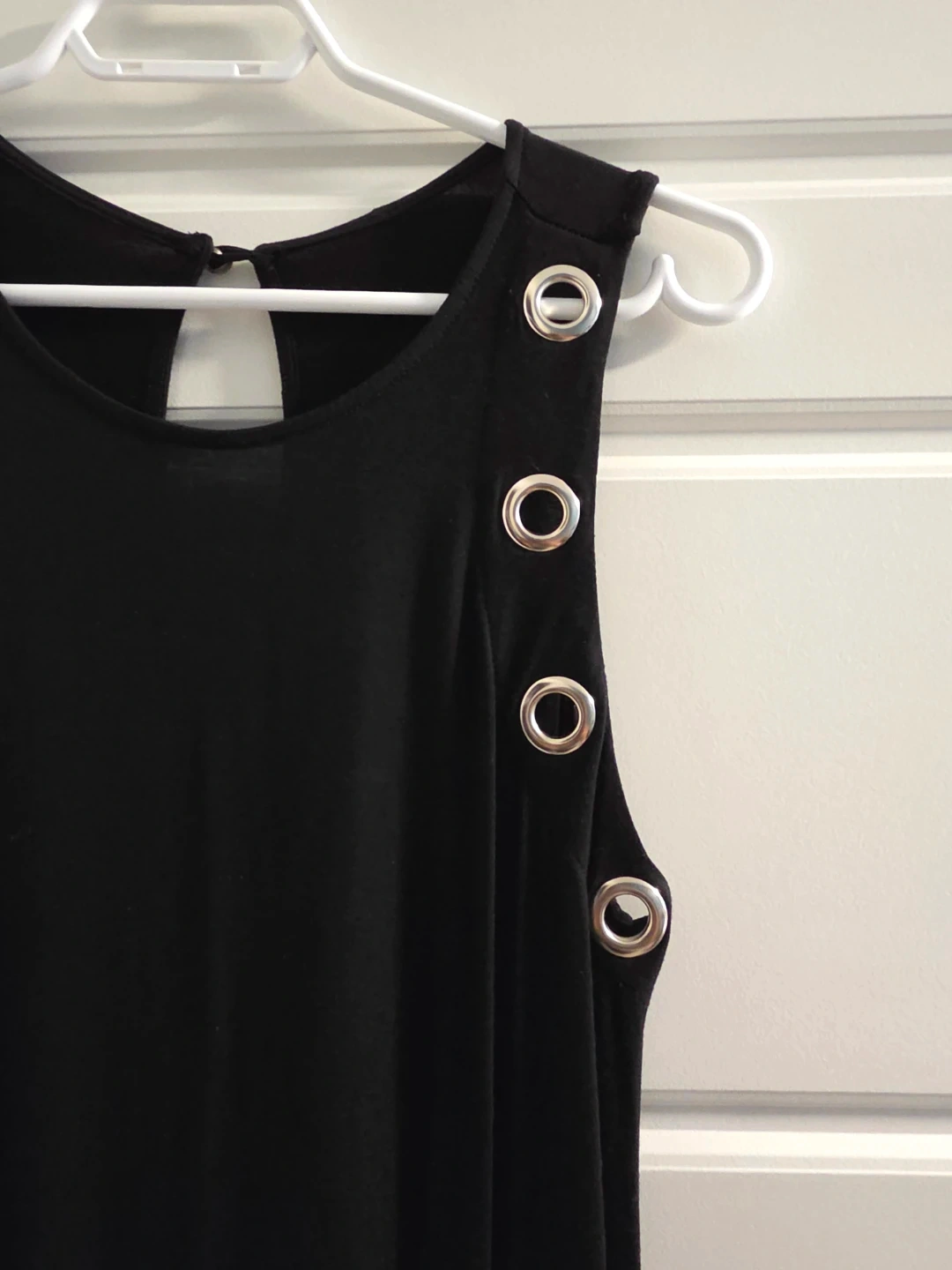 This black sleeveless dress features decorative silver grommets along the sides. It has a keyhole detail at the back neckline. The material looks like a soft jersey knit. { size Medium to Large i believe)