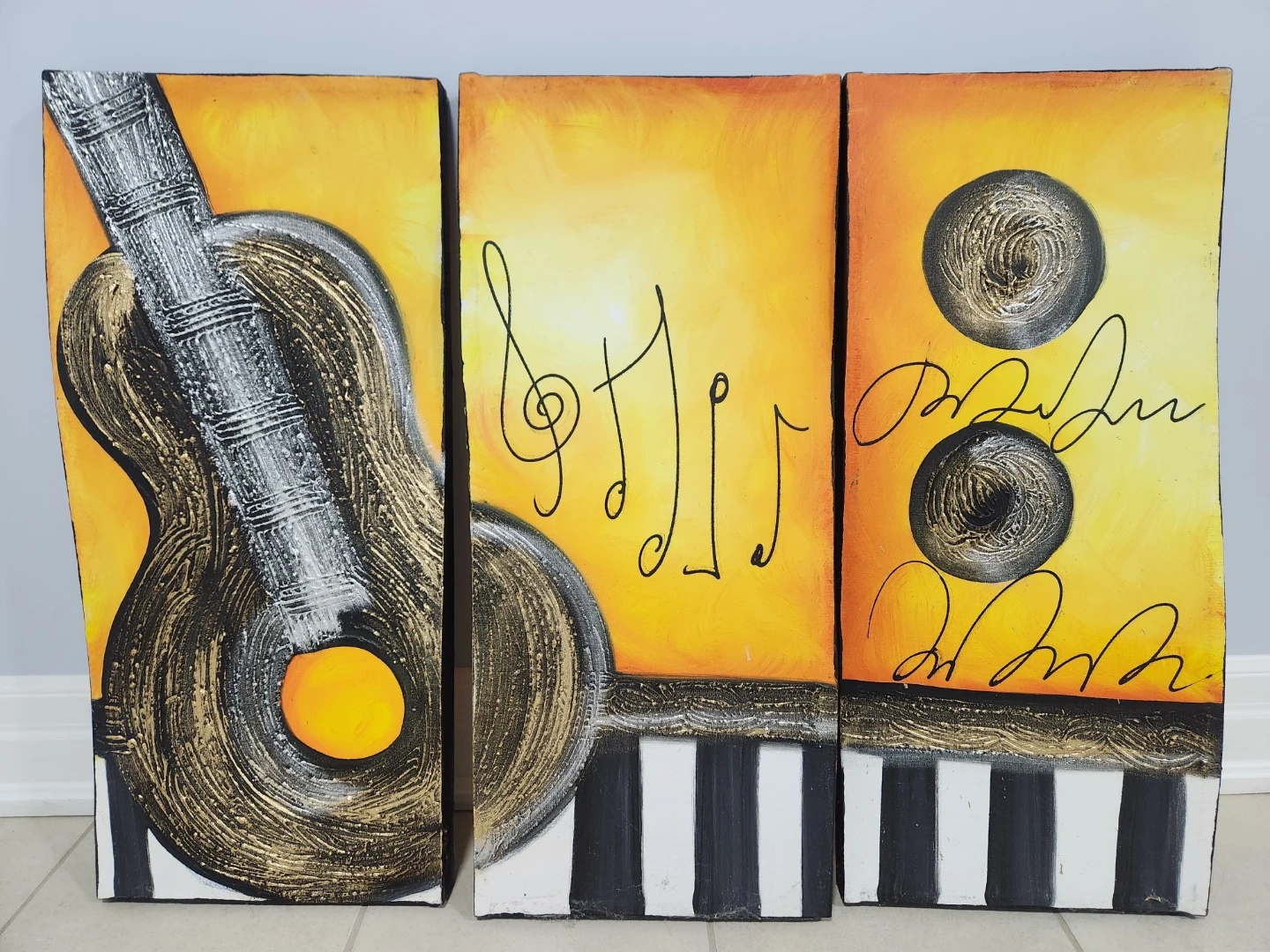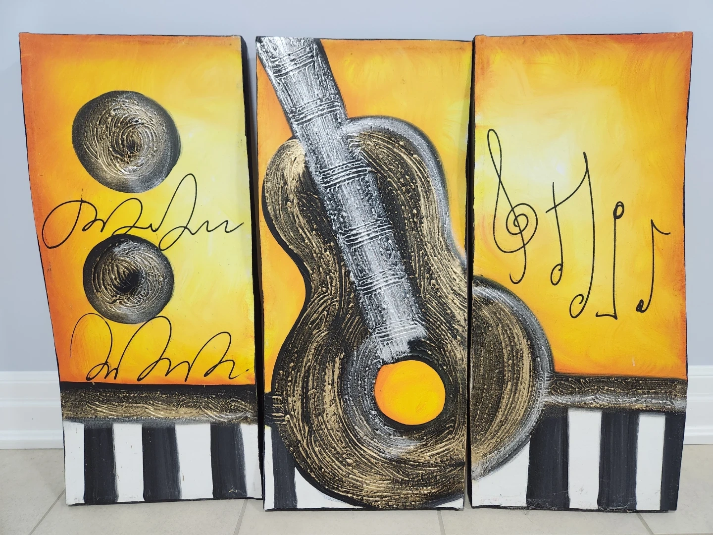 Three-panel canvas wall art featuring a music theme with guitar imagery, piano keys, and musical notes.