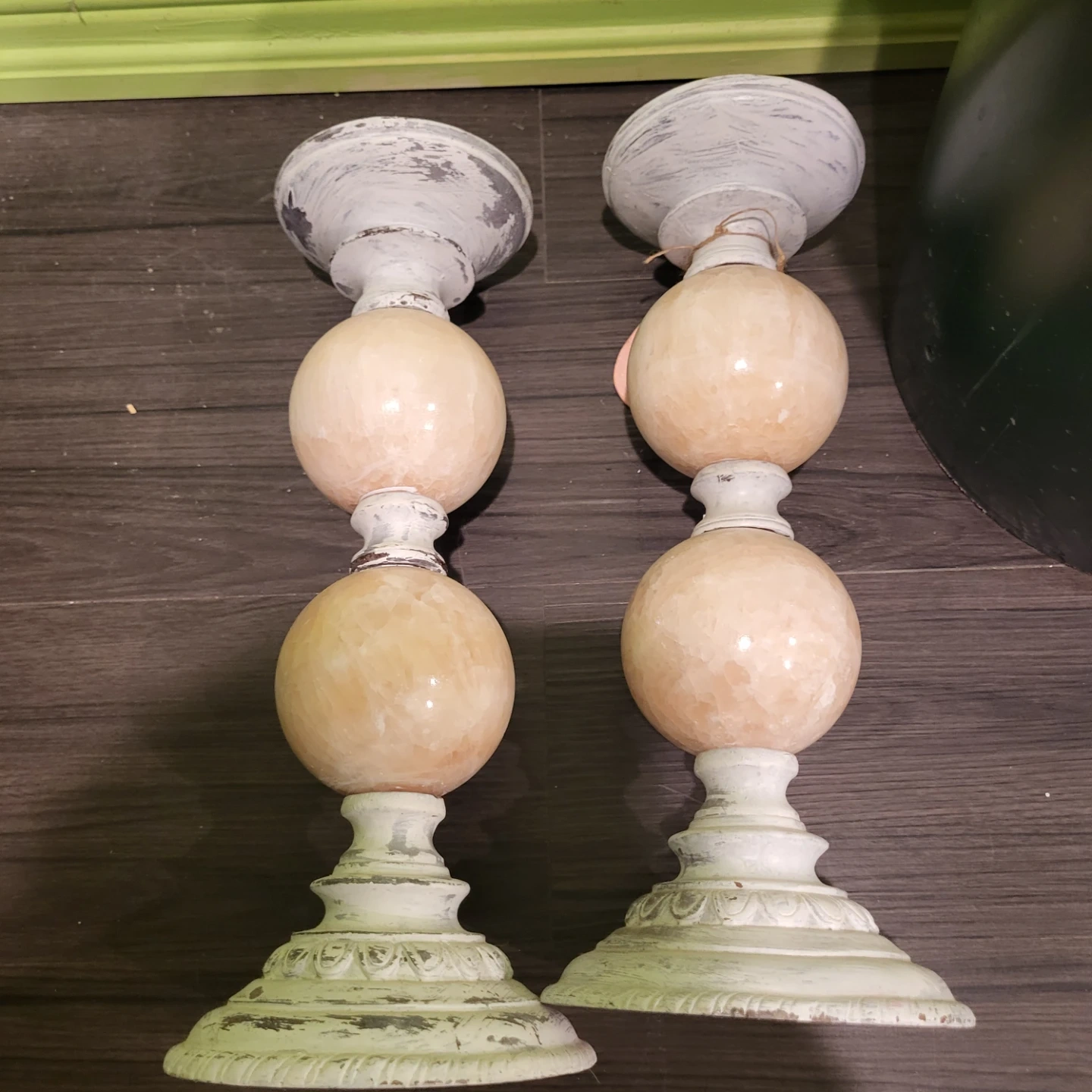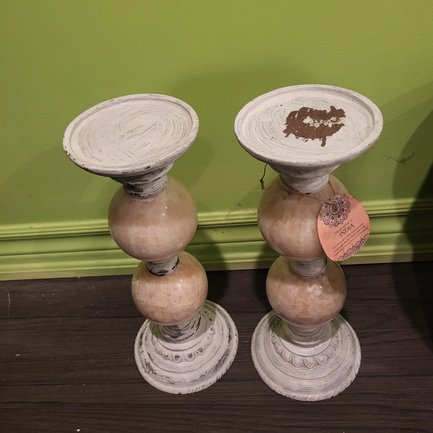 Set of two decorative candle holders. Handcrafted in India with stone spheres and a distressed white base. Perfect for adding a touch of elegance to any room!